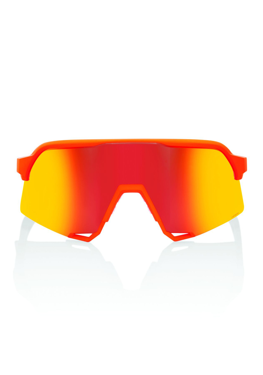 The 100% S3 sunglasses in Soft Tact Neon Orange blend bold style with technical performance. The cylindrical 5.5-base lens offers enhanced peripheral vision and full 360-degree visibility. Made from lightweight, impact-resistant polycarbonate, the lenses are scratch-resistant, offer full UV protection, and feature a HYDROILO coating to repel water, oil, and dirt. Lower air scoops help reduce lens fogging by increasing airflow. The TR90 frame is flexible yet strong, and ultra-grip rubber padding and temple tips ensure a secure fit even under intense exertion. Included are interchangeable lenses – a clear lens (category 0, light transmission 93%) and a HiPER Red Multilayer lens (category 3, light transmission 14%). A D-Ring clip adds extra security.