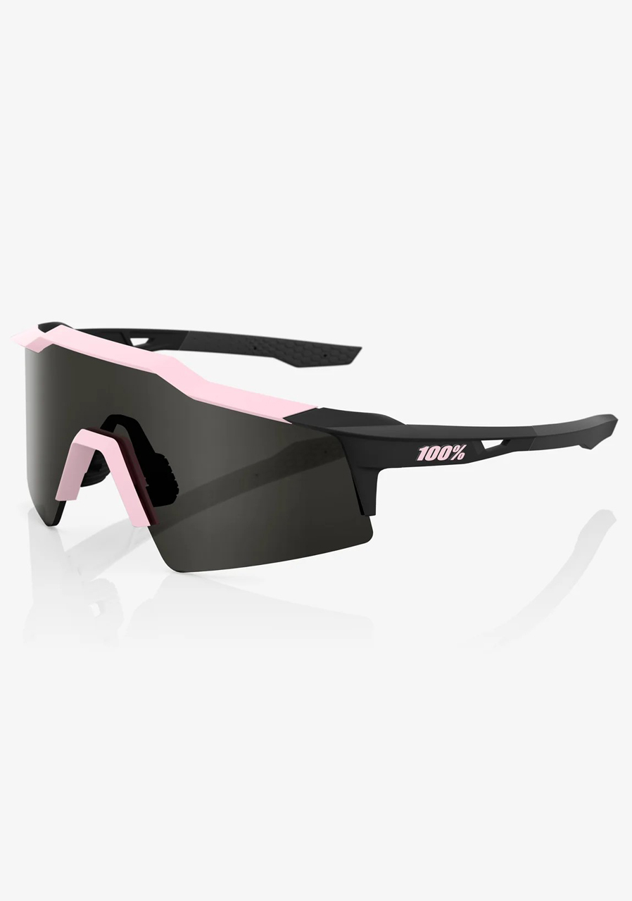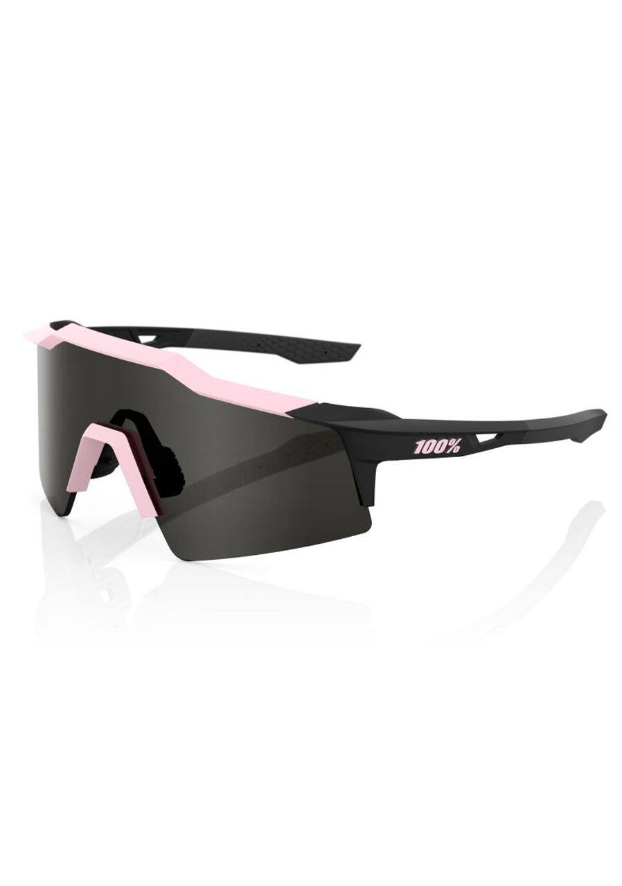 Sports sunglasses with smaller SL profile - durable and lightweight polycarbonate cylindrical lenses with 5-base curvature for better peripheral vision and enhanced protection - 360° visibility for unobstructed field of view - lenses with 14% light transmission (category 3) suitable for bright conditions - 100% UV protection (UV400) - interchangeable lenses with scratch resistance - HYDROILO lens treatment repelling water, dirt, and oil - temple scoops and ventilation channels for moisture management and airflow - lightweight, durable, and flexible Grilamid TR90 frame - ultra-grippy rubber nosepads and temple tips for a secure fit even when sweating - includes clear spare lens (category 0, 93% light transmission) - D-Ring security clip - frame color: Soft Tact Desert Pink - lens color: Smoke.