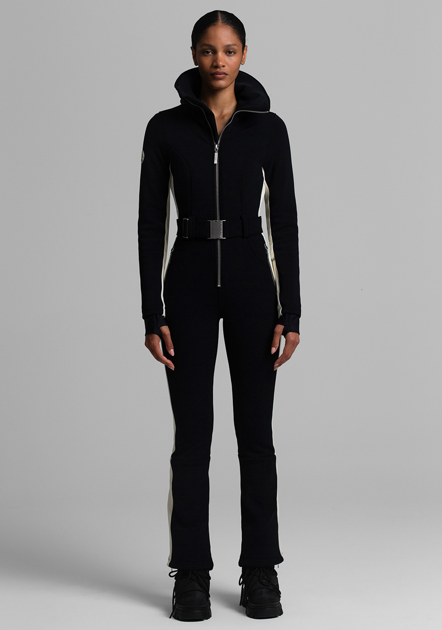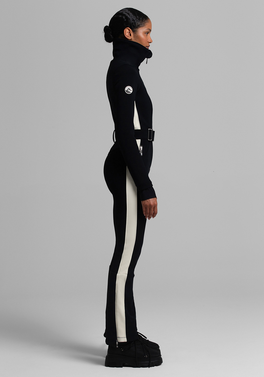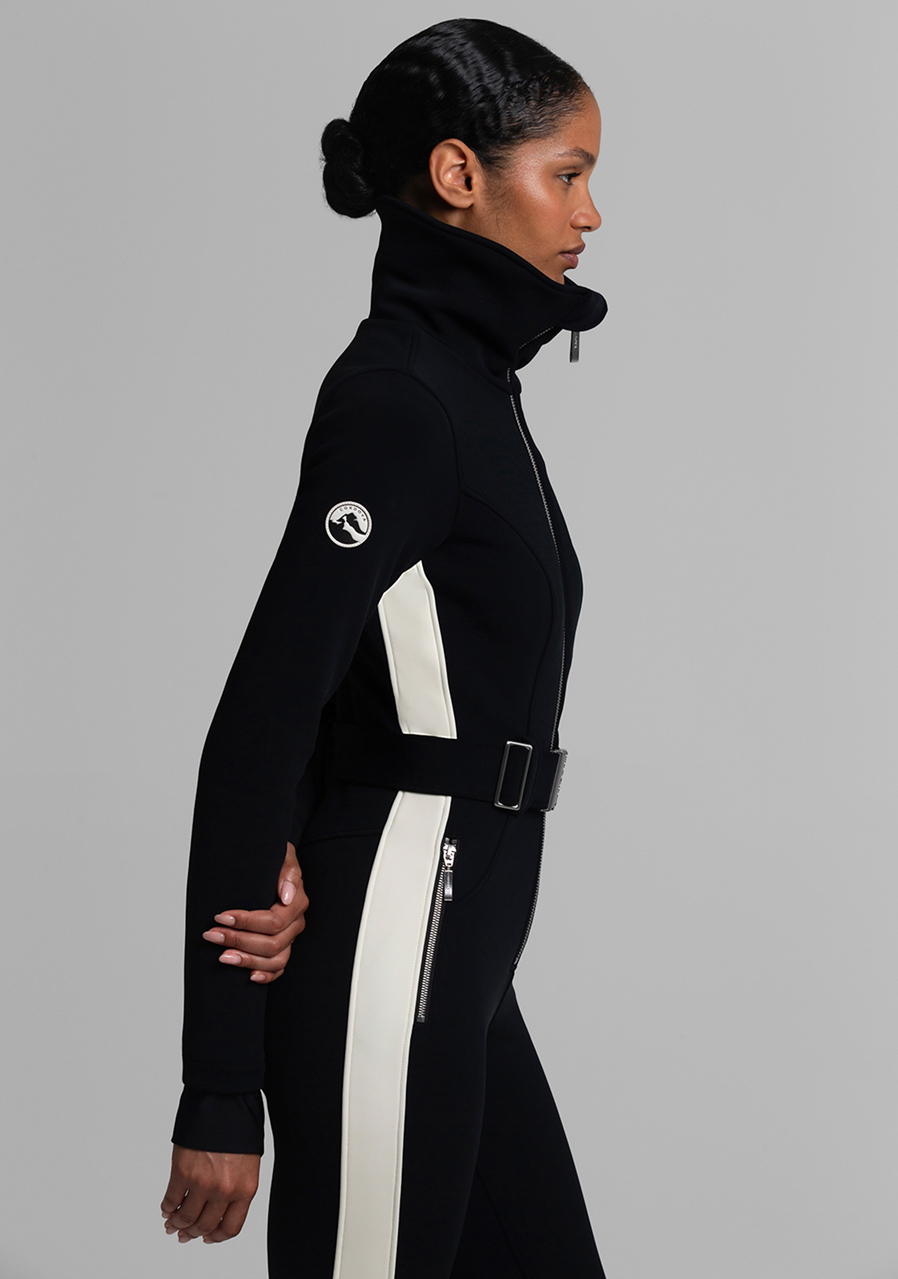 Additional features: Half-zip closure. Elastic waist belt with buckle. Oversized collar can be worn open or closed for extra neck protection. Inner sleeves, waist and pant legs are decorated with a contrasting stripe.