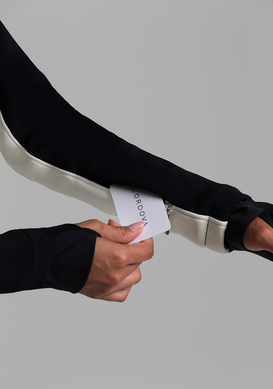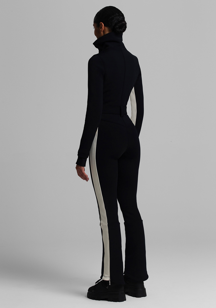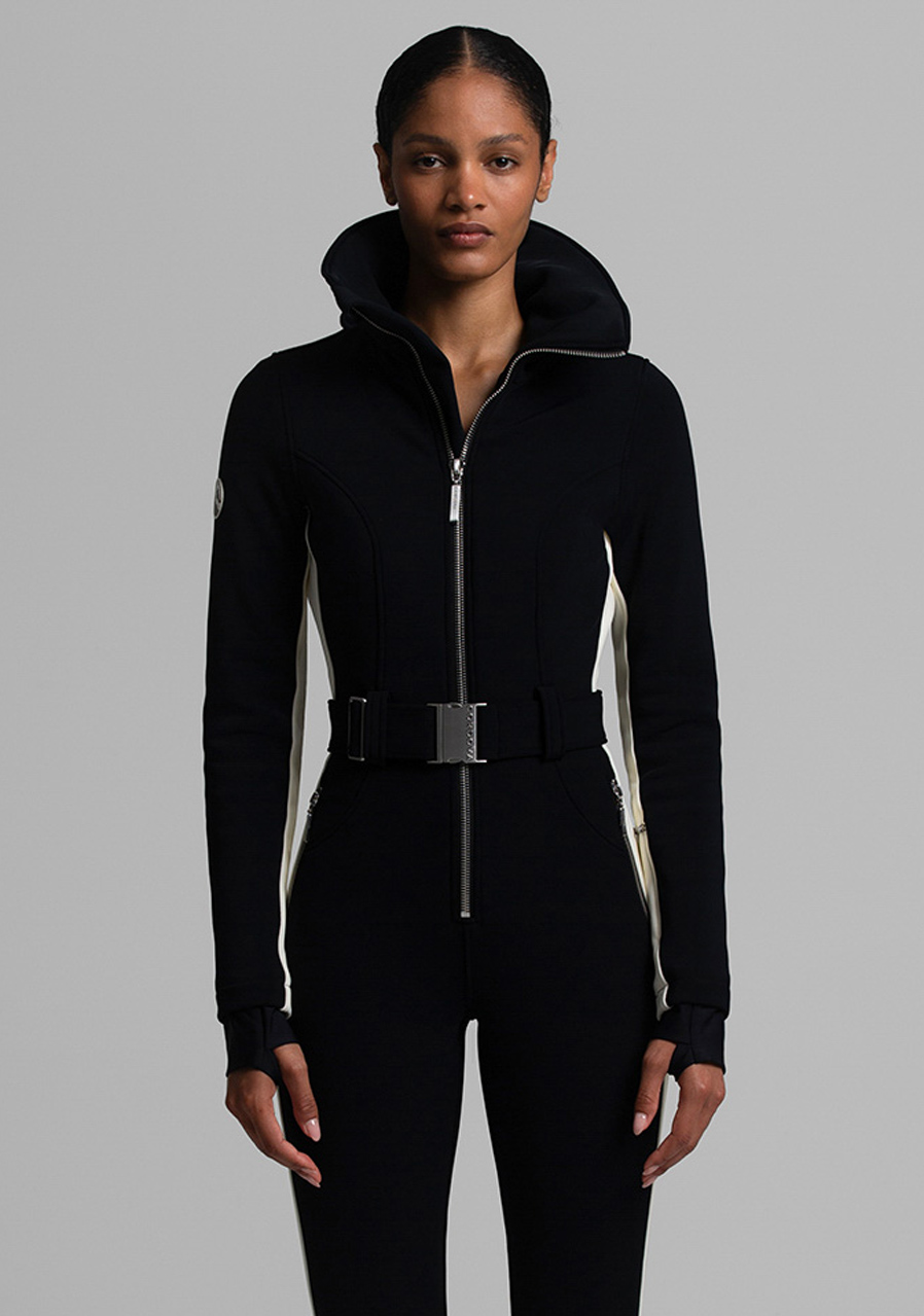 Additional features: Half-zip closure. Elastic waist belt with buckle. Oversized collar can be worn open or closed for extra neck protection. Inner sleeves, waist and pant legs are decorated with a contrasting stripe.