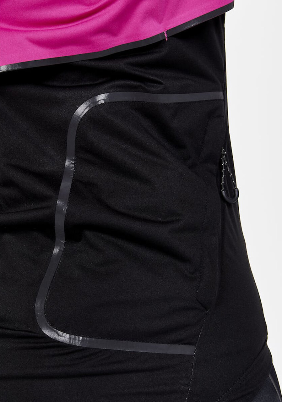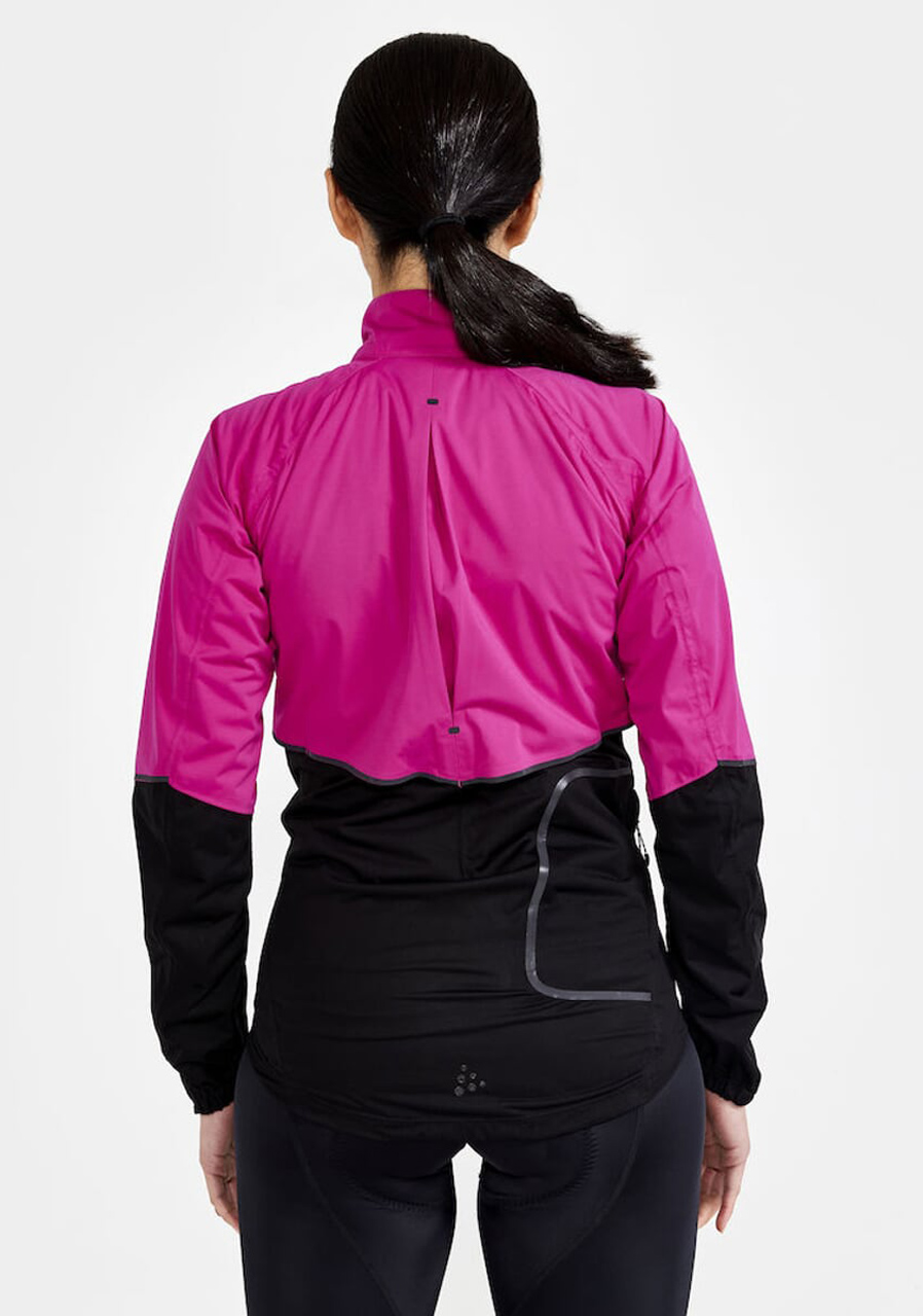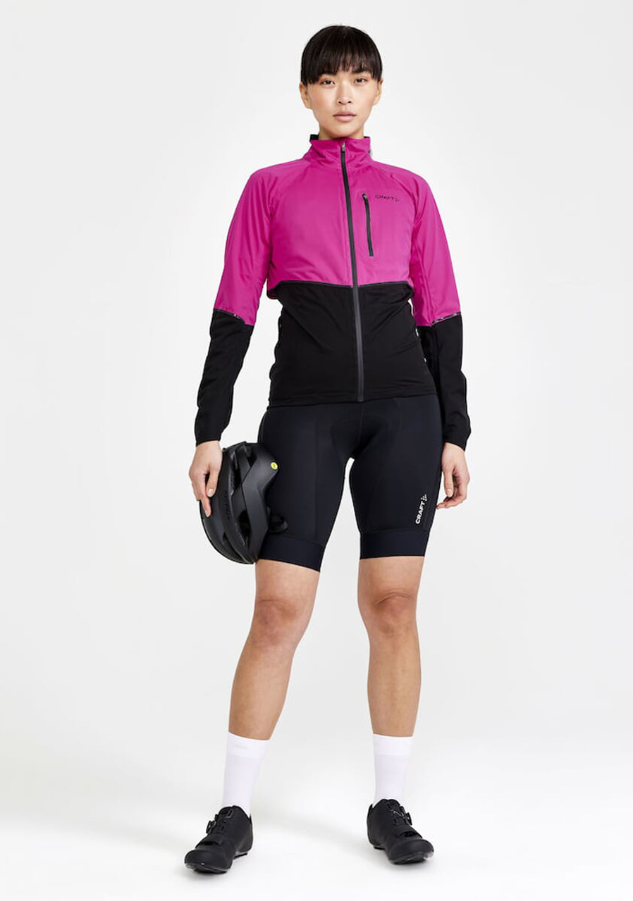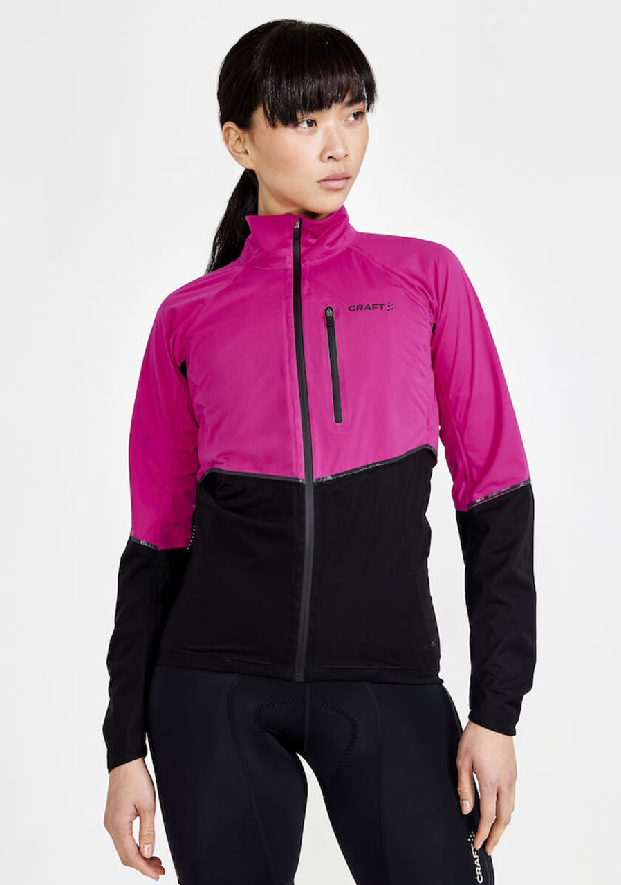 The CRAFT ADV Endur Hydro women's cycling jacket is a lightweight, wind- and waterproof layer ideal for unpredictable weather conditions. Designed with ergonomics tailored to a rider's posture, it includes taped seams, a waterproof rating of 10,000 mm, and breathability of 10,000 g/m²/24h. Features include a longer back panel for added protection, underarm ventilation panels for airflow, and reflective details around the jacket for visibility. The jacket can be packed into its own concealed pocket, and has a brushed fleece collar for comfort and a waterproof zip covered by a protective flap.
