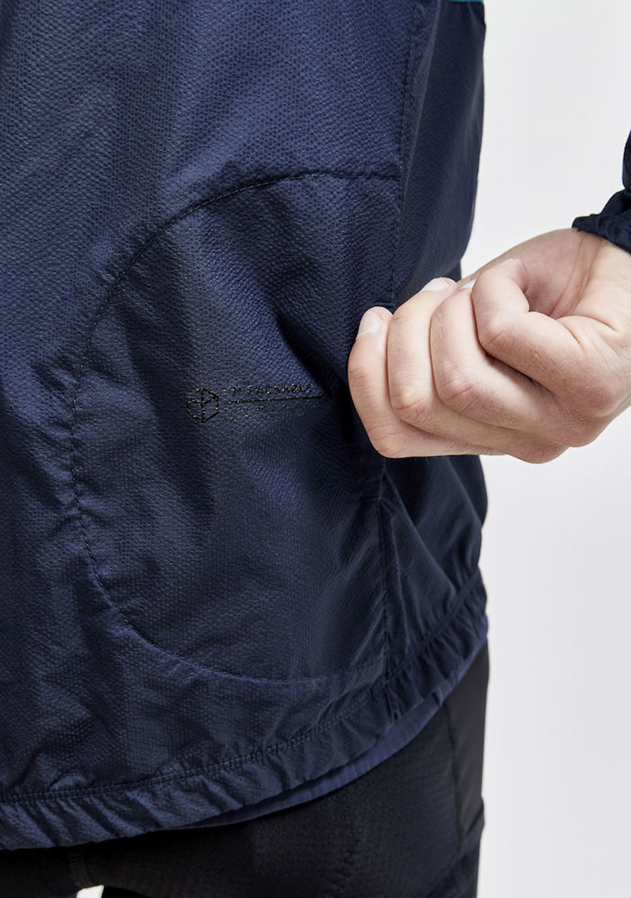 The CRAFT ADV Offroad Wind cycling jacket is a lightweight and wind-resistant option designed for unpredictable and breezy conditions. Made from 100% polyester with a water-repellent finish, this jacket weighs only 45 g/m². Its ergonomic fit is tailored for the cycling posture, providing maximum comfort during long rides. Laser-cut ventilation holes improve breathability, while the extended rear hem with silicone grip ensures a secure fit. It can be compactly packed into an internal pocket hidden in the seam. Reflective elements enhance visibility in low-light conditions.
