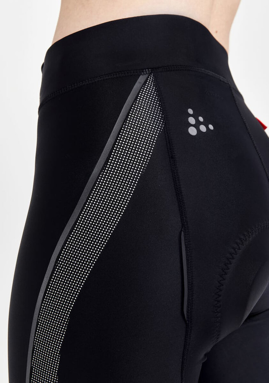 ergonomic fit with strategically placed flat seams leg hems with inner silicone grip to prevent rolling enhanced visibility with strong reflective elements Craft Infinity C2 chamois: elastic, seamless, antibacterial, anatomically shaped for women padding thickness – seat: 12 mm, center: 8–10 mm, edges: 3 mm foam density: 60–80 kg/m³ material: 78% recycled polyamide, 22% elastane