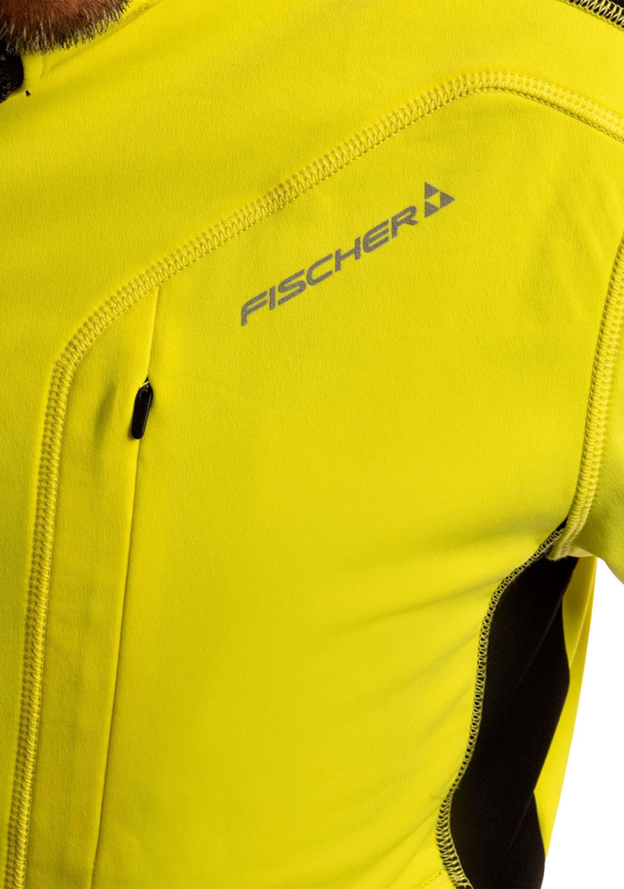 Featuring a sporty, anatomical cut that won’t restrict motion, the wind‑resistant softshell exterior has a DWR (durable water‑repellent) finish, while the gently brushed inner lining provides cozy thermal comfort. Breathable panels optimize ventilation during activity. Practical zippered pockets hold essentials, reflective details enhance safety in low light, and the sleek black‑and‑yellow Fischer design complements your athletic gear.