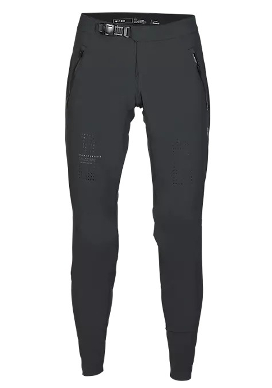 The women's Fox W Flexair Pants prioritize freedom of movement, lightweight performance, and optimal breathability. Constructed with TruMotion™ 4-way stretch and moisture-wicking TruDri™, these pants keep you dry and flexible on technical trails. Strategically placed laser-cut perforations enhance airflow, while the DWR coating repels water, mud, and dirt. A superlight, tapered silhouette without a front zipper maximizes comfort. The Race Ratchet closure allows quick, secure waist adjustments. Two bonded zip pockets provide storage for essentials.
