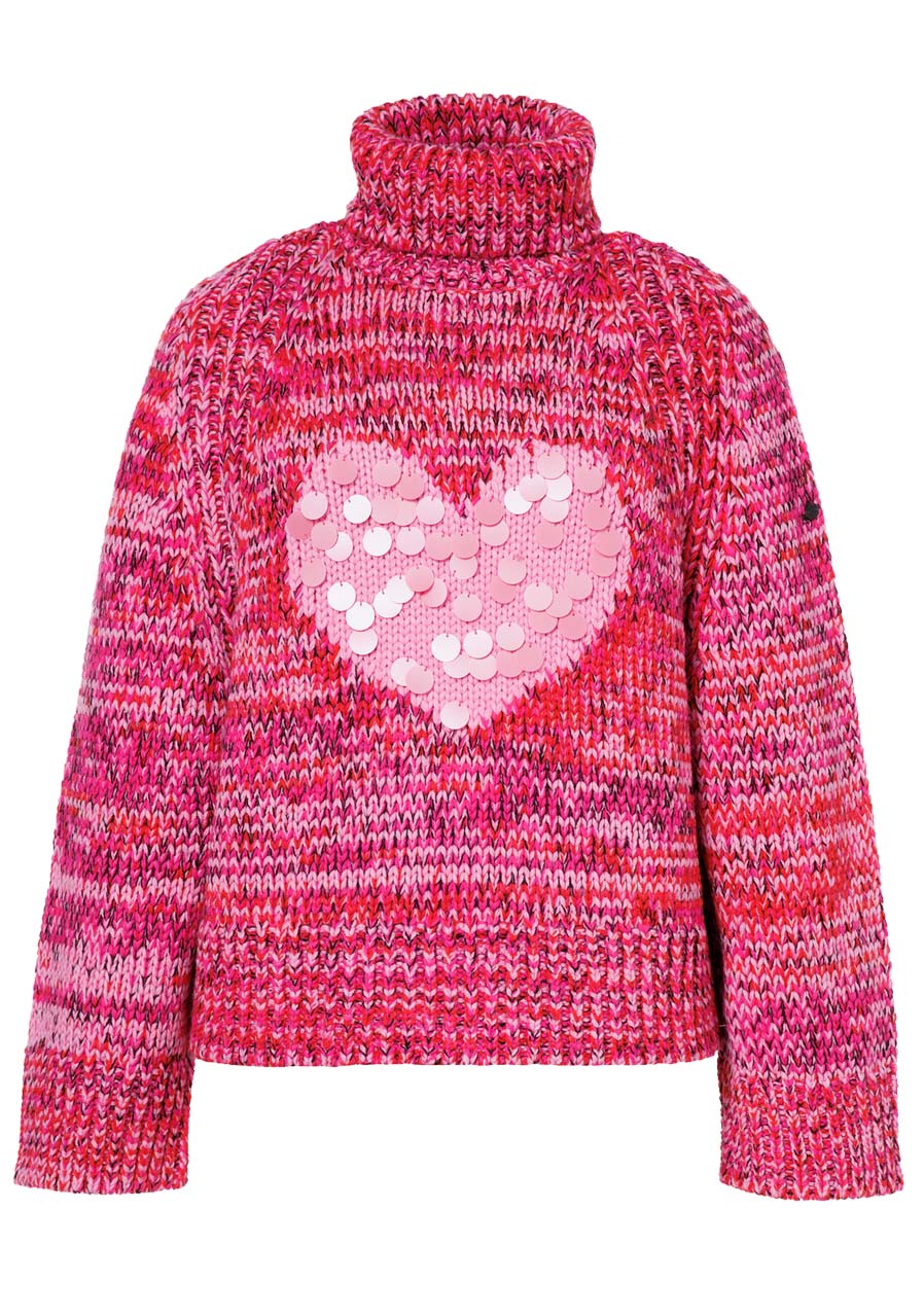 The Goldbergh Aimee Long Sleeve Knit Sweater in the Flame/Pink color combination is a stylish and versatile piece, ideal for everyday winter wear. This chunky knit sweater is made from a blend of acrylic and wool, ensuring warmth and comfort with a soft feel to the touch. It features a relaxed fit with straight sleeves and a fold-over ribbed collar for a casual and laid-back look. The sweater is perfect for light outdoor activities or as a layer under a jacket. A heart-shaped pattern on the chest with subtle sequins adds an elegant touch to the design.