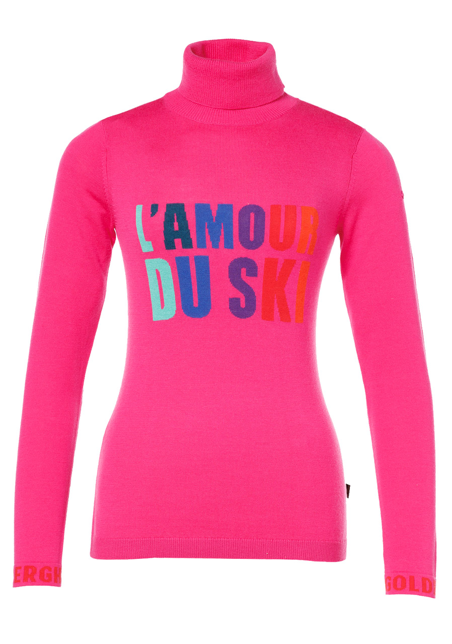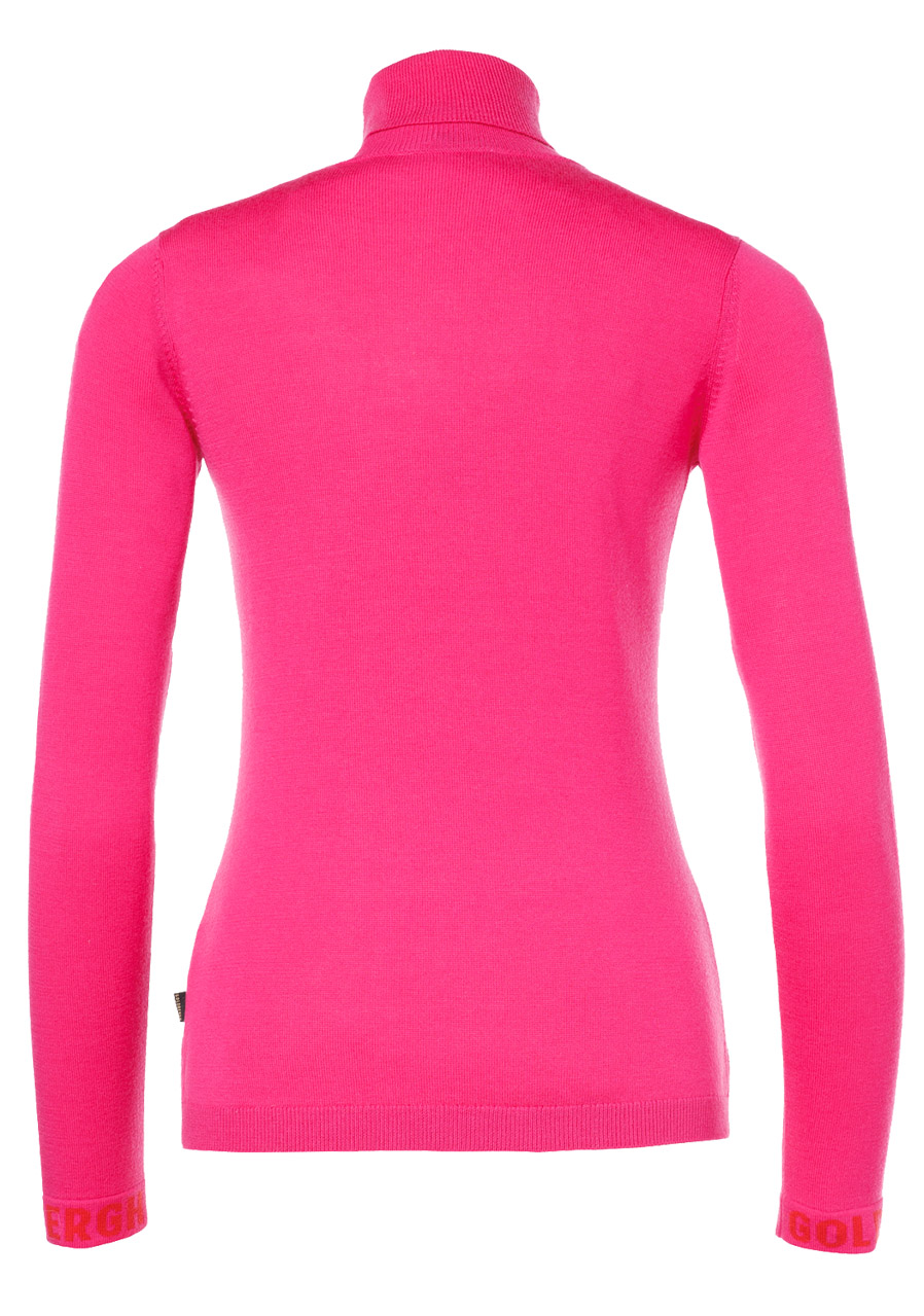 The Goldbergh Amour Long Sleeve Knit Sweater in Passion Pink is a stylish and functional piece, ideal for urban outdoor activities and cooler weather. Thanks to the merino wool, it offers excellent insulation while remaining breathable. The slim fit cut ensures a close and elegant look. The design features include the Goldbergh logo on the cuffs, along with a metal brand logo on the sleeve. The fold-over collar provides both warmth and a stylish touch, making it perfect for colder days.