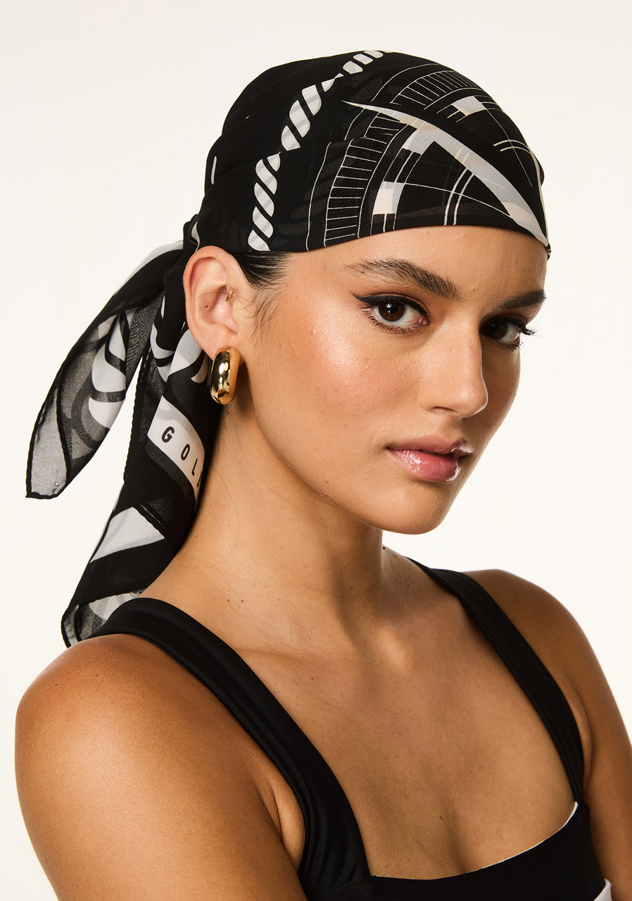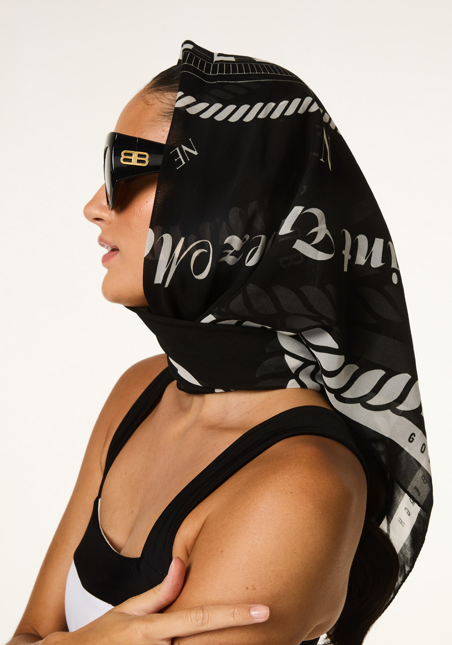 The woven chiffon scarf is a luxurious accessory for any woman seeking elegance and a pleasant material. It can be worn around the neck or on the head. Perfectly matches black or white outfits. The white nautical patterns add a stylish touch.