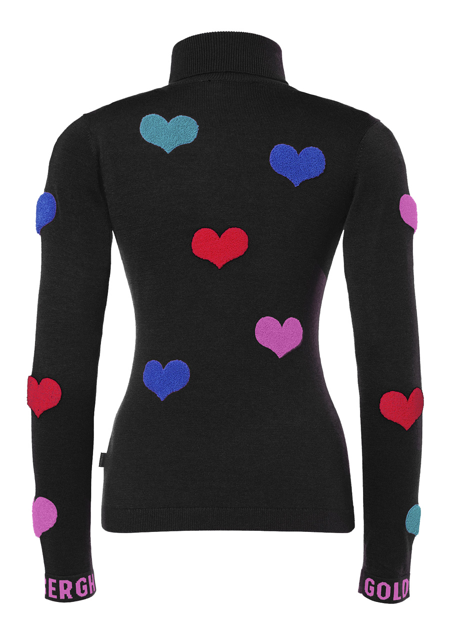 This slim fit sweater is crafted from a soft knitted material, offering comfort and a pleasant feel when worn. The fitted fold-over collar and cuffs are adorned with contrasting “Goldbergh” embroidery, giving the piece a sophisticated look. All-over chenille heart embroidery adds a playful and fashionable touch. A metal logo on the sleeve and a woven brand label on the side complete the design. The sweater fits true to size; your regular size is recommended.