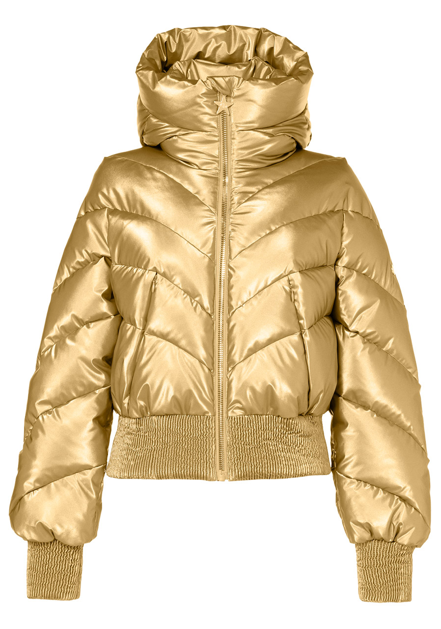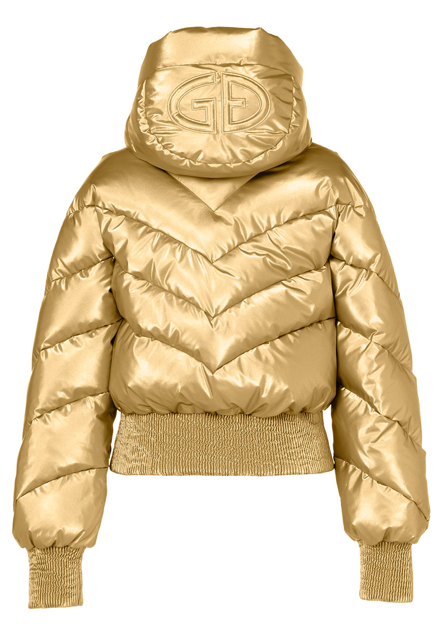 The Goldbergh Caro Ski Jacket in gold is a luxurious women’s ski jacket designed for stylish skiers who want to stay warm while looking fashionable on the slopes. This jacket combines premium functionality and design, which is characteristic of the Goldbergh brand. It is made from durable, water-repellent material that protects against wind and moisture, and features certified goose down insulation for maximum thermal comfort. The jacket has an elegant design with a modern regular fit cut that flatters the female silhouette, and is equipped with two outer and two inner pockets, as well as a small sleeve pocket designed for a ski pass. It also includes a fixed hood and knitted cuffs inside the sleeves. An ideal choice for those seeking a blend of athletic performance and fashion elegance.