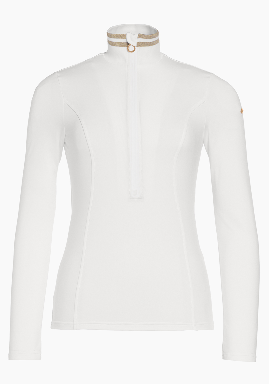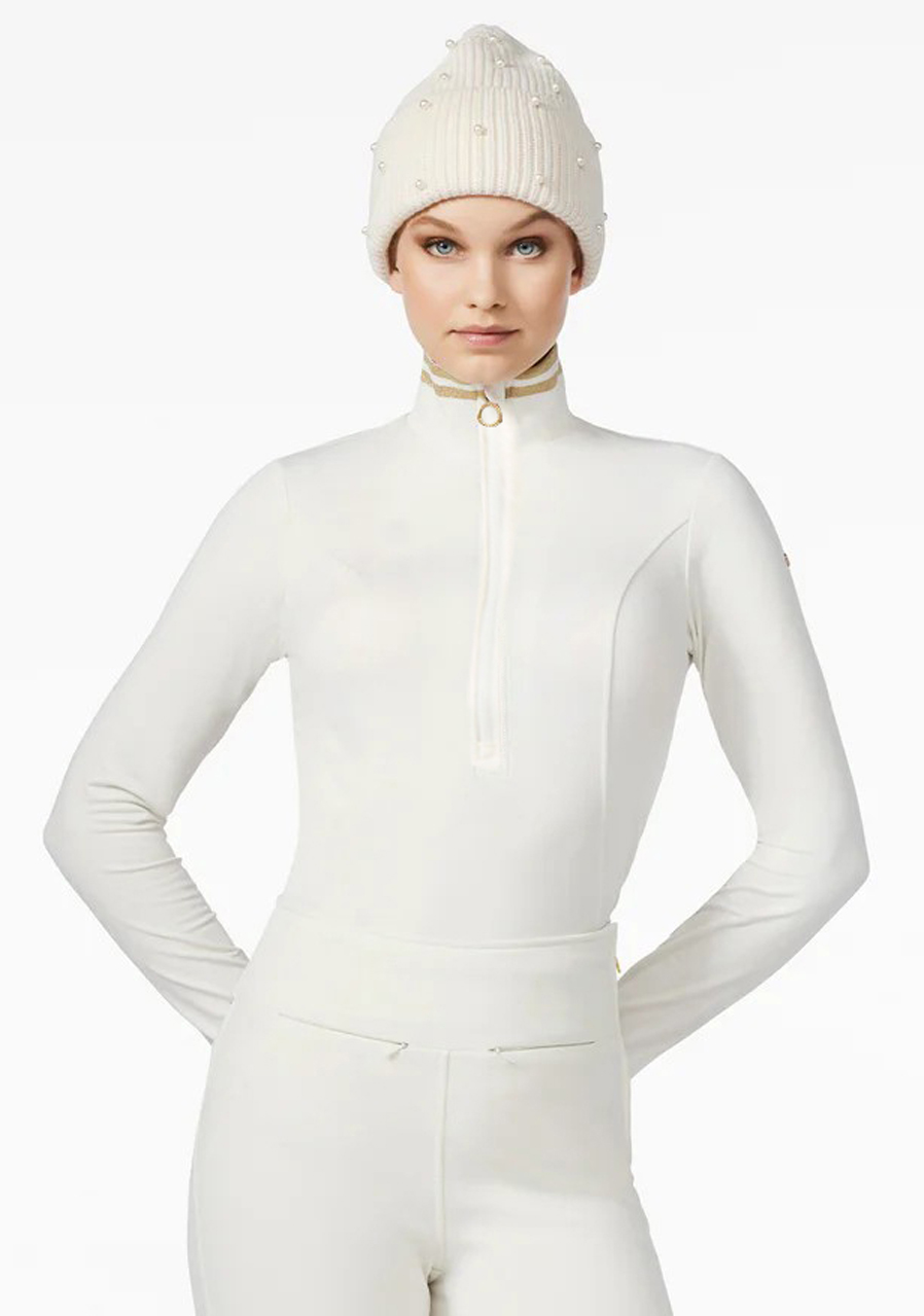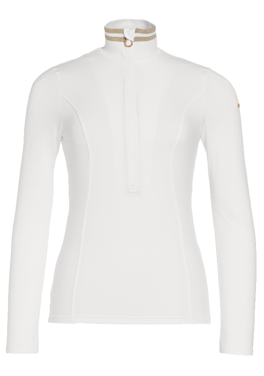 The Goldbergh Diane Ski Pully in Cream is an elegant and functional women’s ski pullover that perfectly combines style and performance. Made from high-quality fabric with a brushed inner finish, it offers excellent comfort and keeps the body warm even during demanding winter activities. This slim-fit model features a high collar with lurex detailing and a zip at the neck for better temperature regulation. The material is stretchy, quick-drying, and effectively wicks away moisture – ideal for high-intensity sports. This pully is not only practical but also a stylish choice for women who want to look good and feel comfortable on the slopes. Perfect for active women who don’t want to compromise between fashion and functionality.