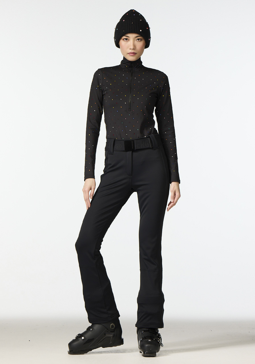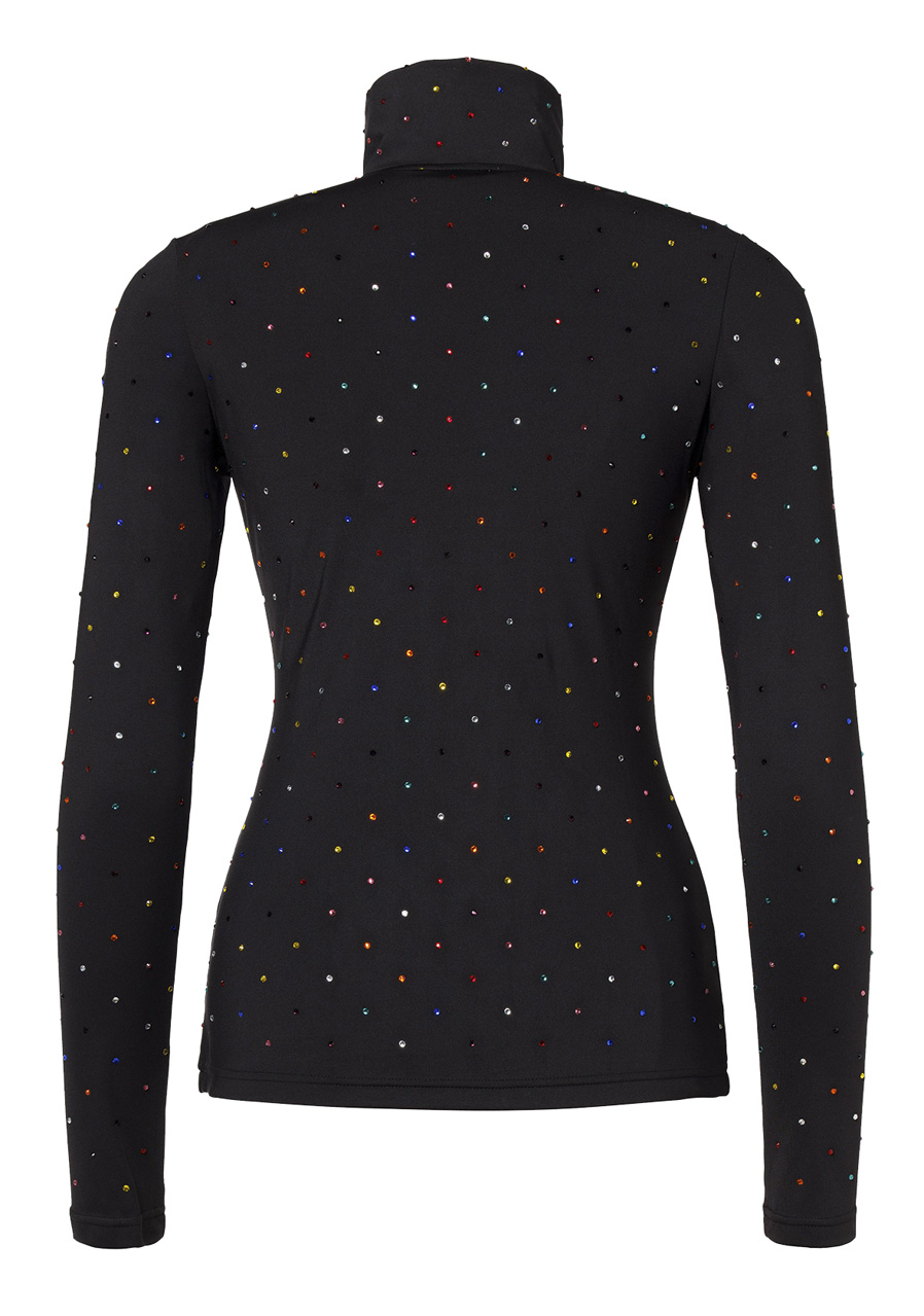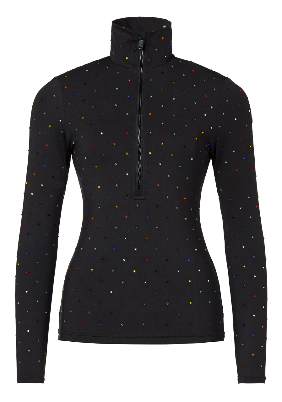 This slim-fit top is crafted from powerstretch material with a soft brushed interior that ensures maximum comfort. The extended half-zip and narrow stand-up collar add a sporty touch, while the all-over colorful strass detailing brings a unique and luxurious finish. With functional features such as quick-drying properties, moisture management, and anti-odor treatment, it is the perfect companion for both winter sports and leisure time.