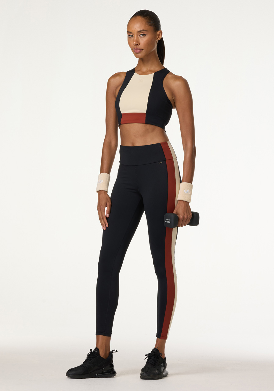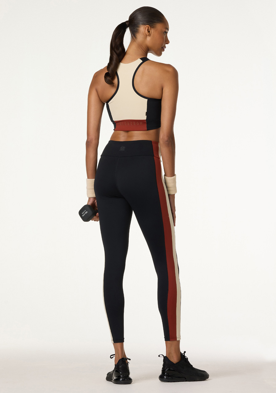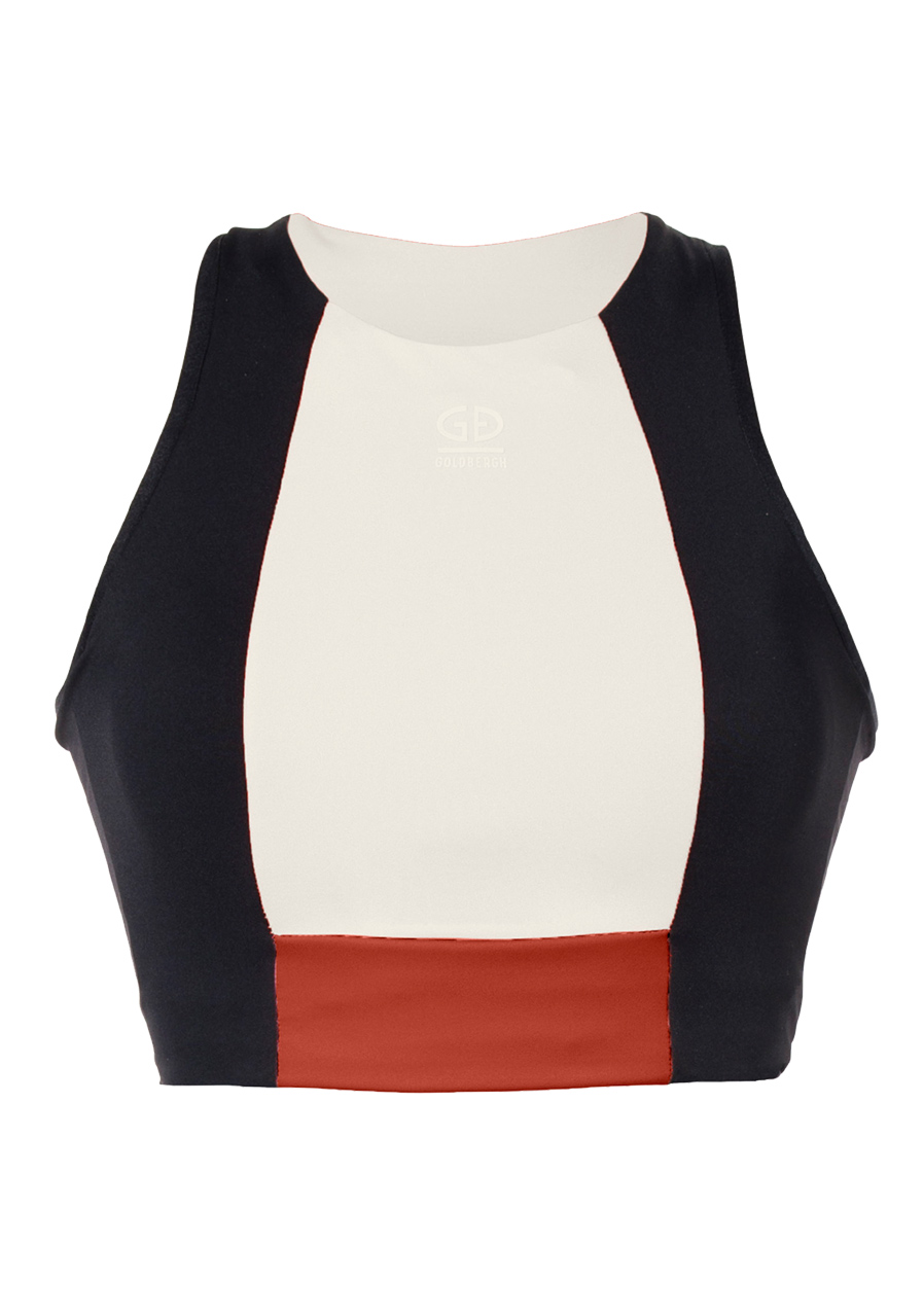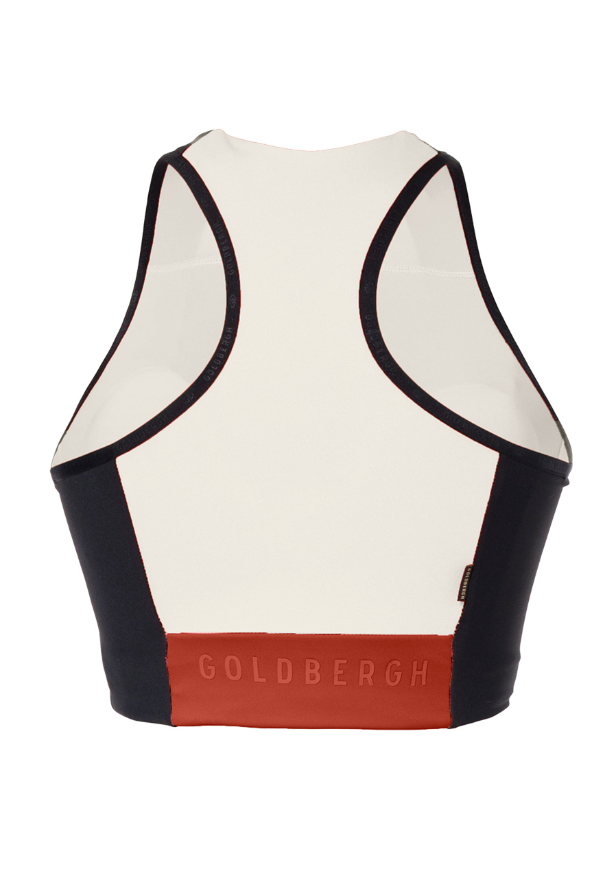 The Goldbergh Facade bra in a modern sporty style, decorated with colored side panels in a color-blocking design. The bra provides medium support during active days. An attractive look that draws attention. Quick-drying, stretchy PowerStretch fabric that effectively wicks away moisture and odor. Thanks to its antibacterial properties, it ensures a constant feeling of freshness. The straps at the back are in a narrow racerback style. The bra also has padded cups and a soft mesh-lined band under the bust. Goldbergh brand name on the back.