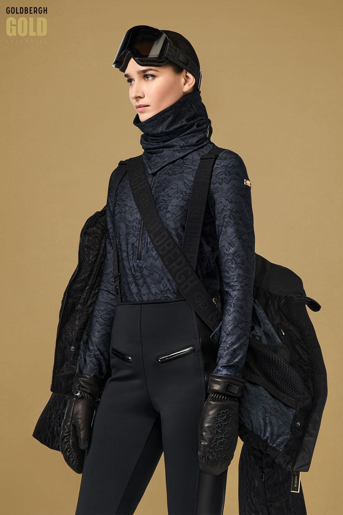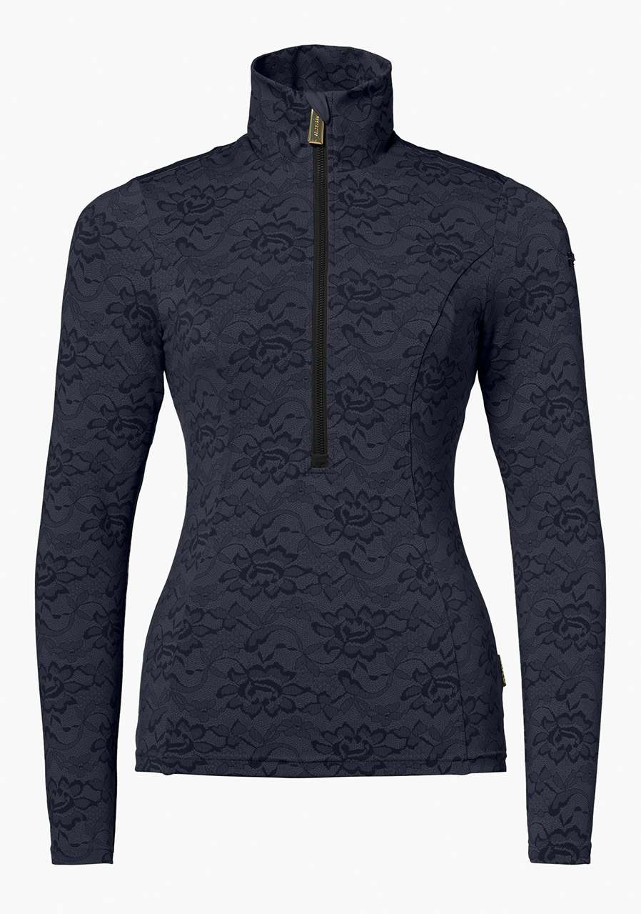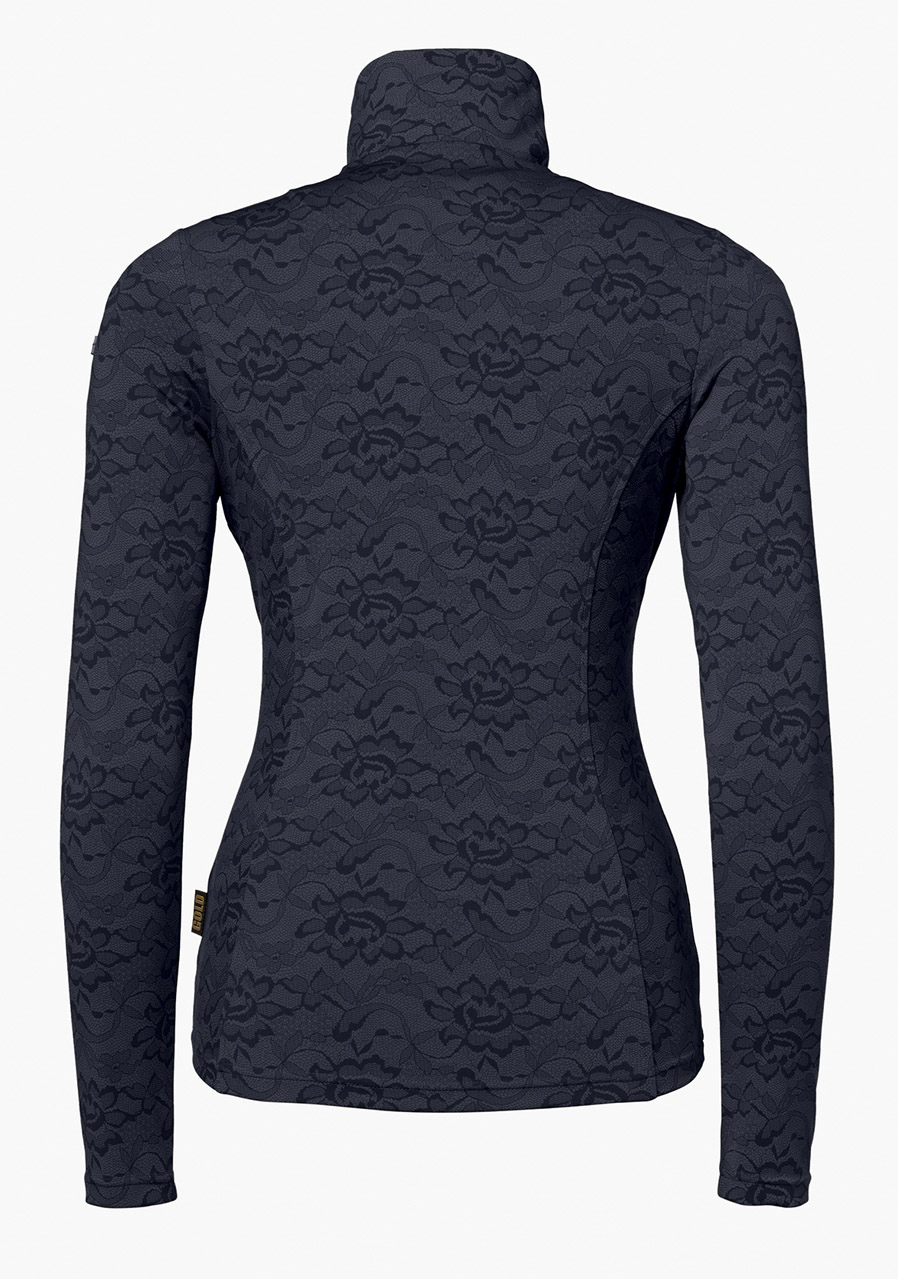 This slim fit top combines modern design with functionality and comfort. The lightweight, stretchy fabric ensures ease of movement and warmth, while a narrow stand-up collar and front ½ zip provide easy dressing and ventilation. Lace detailing along the panels adds a sophisticated and feminine touch. A metal GOLD zipper pull and logo on the sleeve, together with a woven GOLD label on the side seam, enhance the luxurious finish. The top fits true to size.