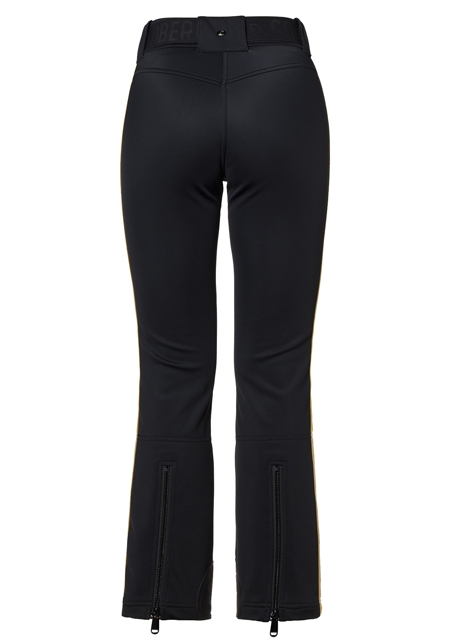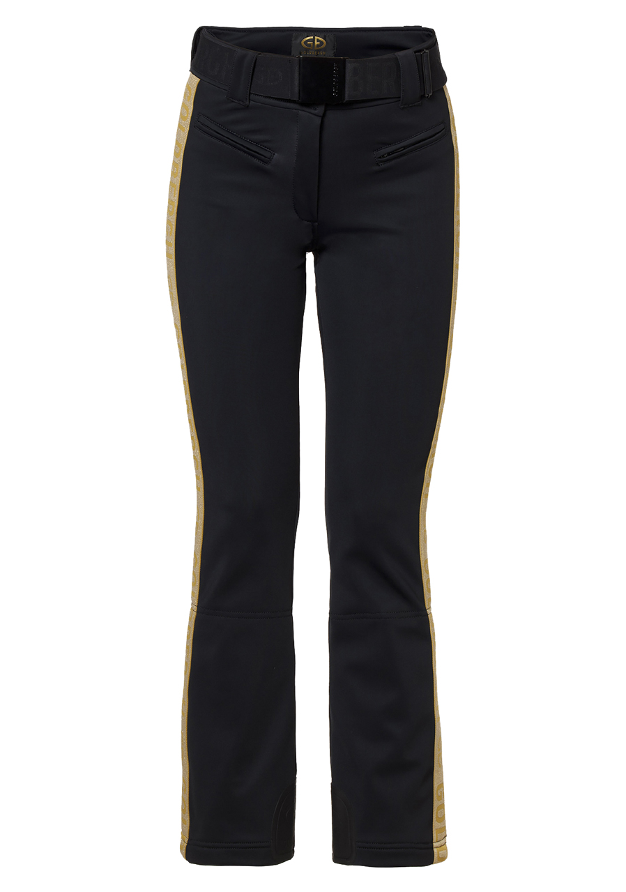 These women’s ski pants in a close-fitting slim cut combine comfort with an attractive look. Two pockets provide space for small essentials, while the elastic waistband ensures a perfect fit. Snow gaiters protect against snow penetration, and zippers at the leg openings make it easier to slip the pants on over boots. A gold decorative stripe along the side seam adds an elegant detail. The pants have a standard fit, so we recommend choosing your regular size.