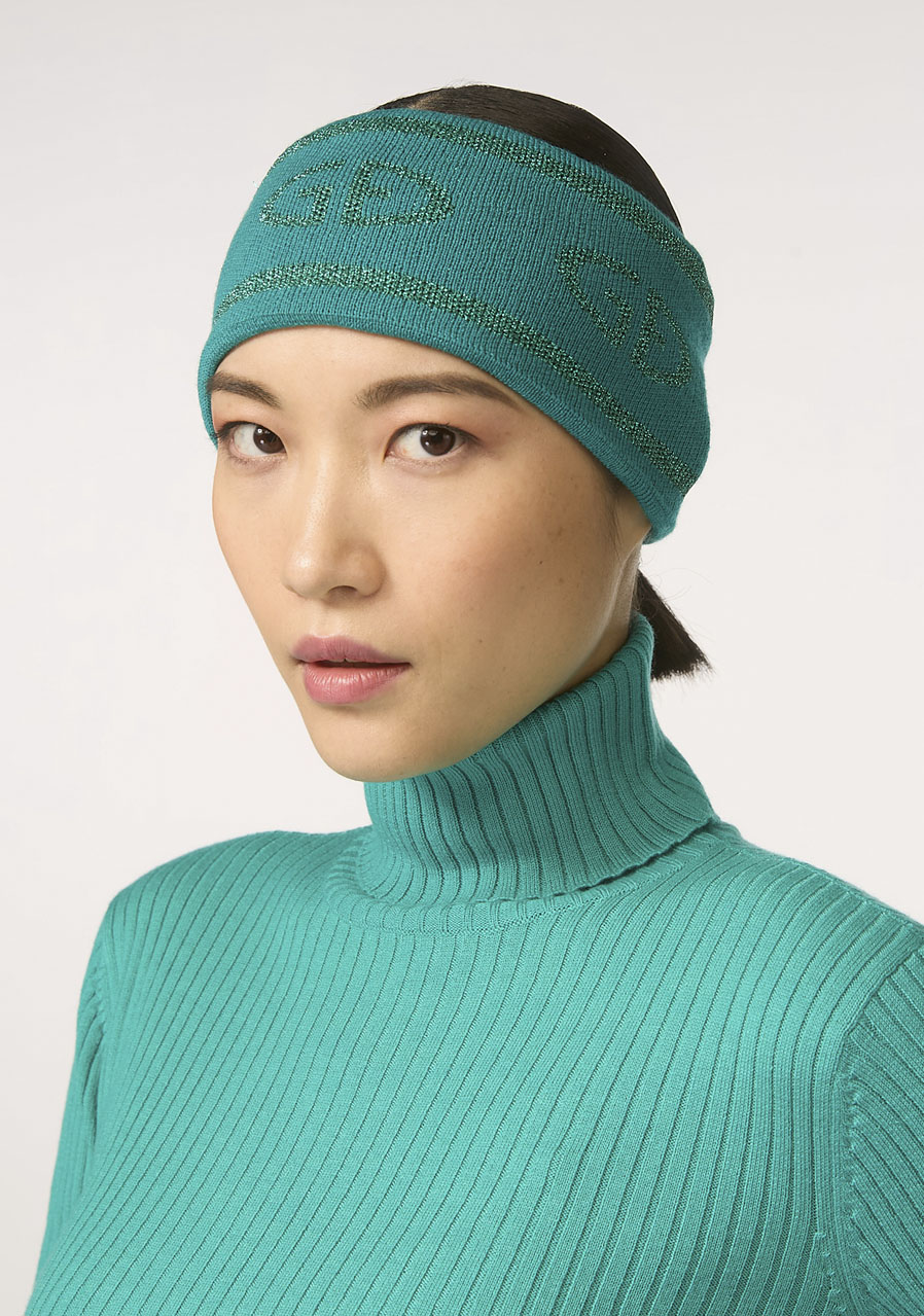 Parameters: Material: 100% merino wool Lining: 100% polyester (polar fleece) Cut: fine knit with tonal lurex jacquard GB logo Length: 23 cm (from folded edge to folded edge) Size: One size Brand label: woven, placed on the back seam