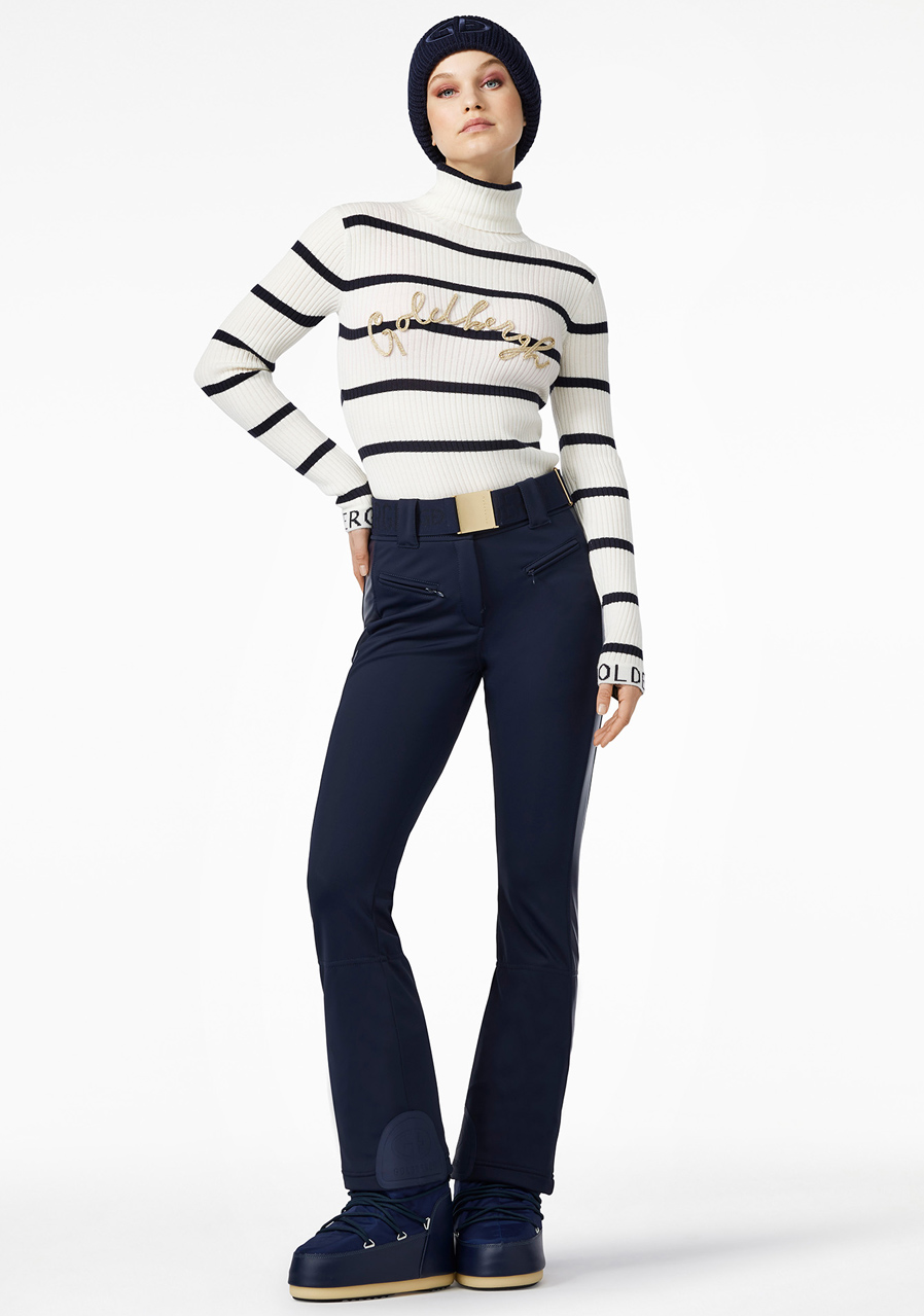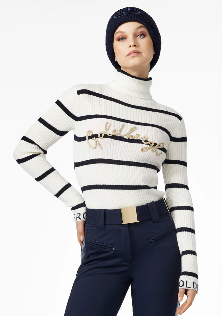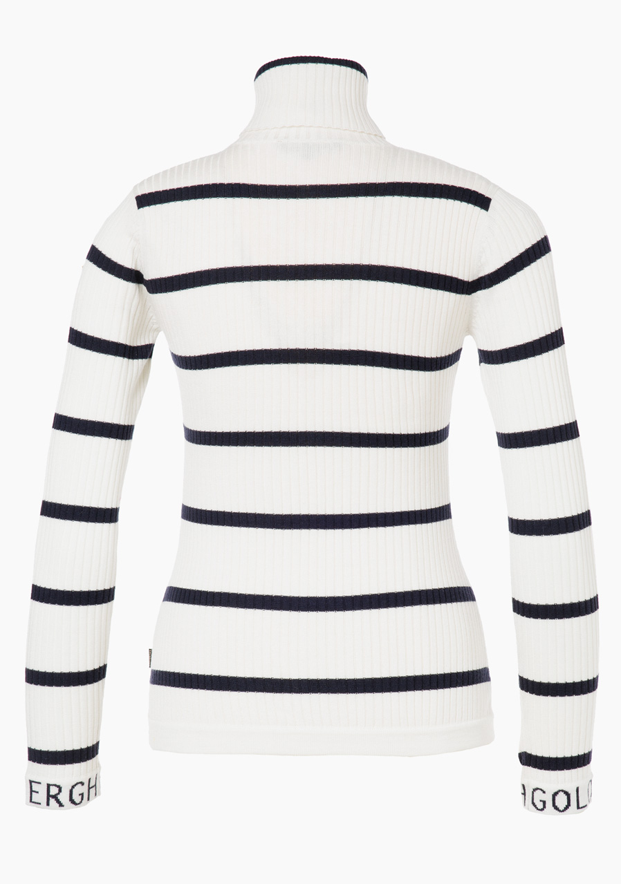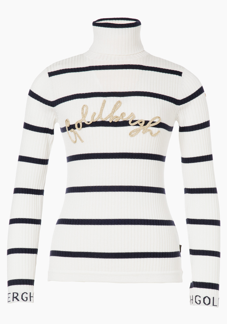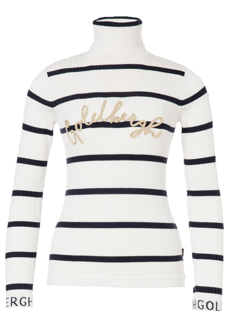 The stylish women's sweater Goldbergh Mimi Long Sleeve Knit Sweater is the ideal choice for active women who love both sport and style. Its nautical-inspired design with blue and cream stripes and the decorative brand logo on the sleeve hems adds elegance to the outfit, while functional features ensure maximum comfort when worn. The sweater is ideal for outdoor sports, light hiking, or leisure activities in cooler weather. It is breathable enough to keep the body dry and warm during moderate physical activity. The sweater has a slim fit cut with long sleeves and is made from 4x3 ribbed knit, which fits the body perfectly and provides excellent heat insulation. It is designed for maximum comfort and freedom of movement while maintaining an elegant and timeless look. This sweater is a perfect addition to both sporty and casual outfits, guaranteeing both style and comfortable wear.