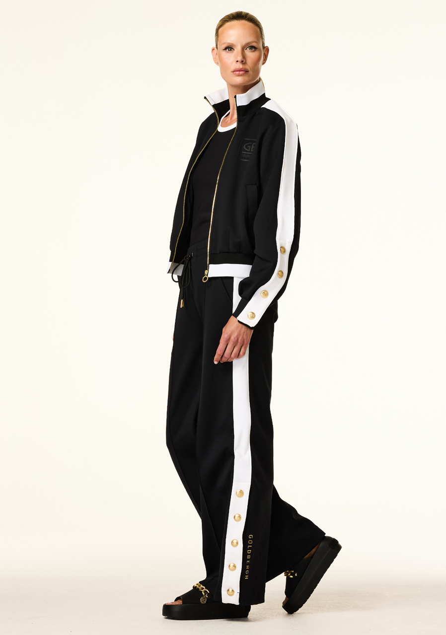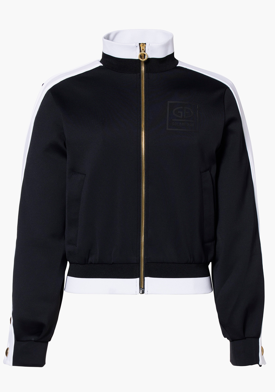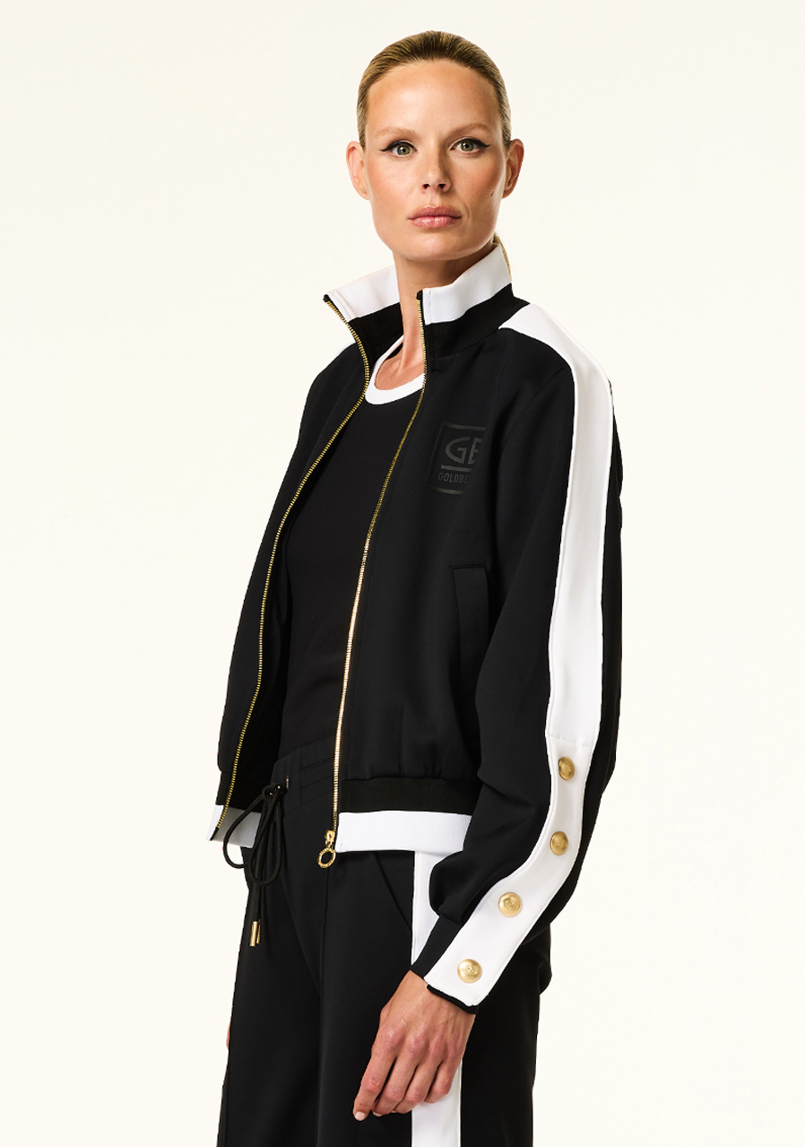 The stylish shortened women's jacket Goldbergh Monaco is characterized by sporty elegance and functionality. The luxurious design inspired by a summer outfit in the spirit of the Côte d'Azur can be perfectly combined with Grimaud trousers, for example. The jacket is made of elastic tracksuit material, which provides maximum comfort and freedom of movement. The classic retro style is complemented by contrasting details with gold buttons on the sleeves and at the waist on the hems. The long zipper and pockets add practicality to the jacket, making it a great casual companion for days spent both in the city and in nature.