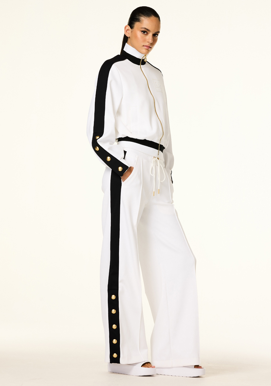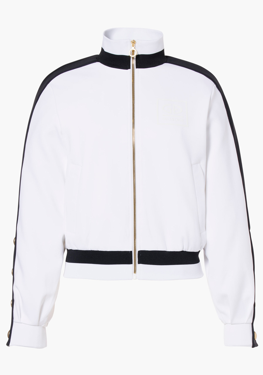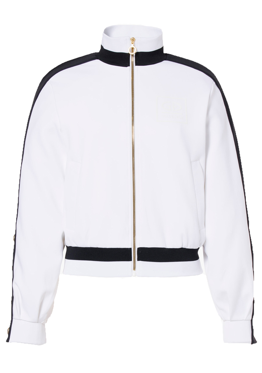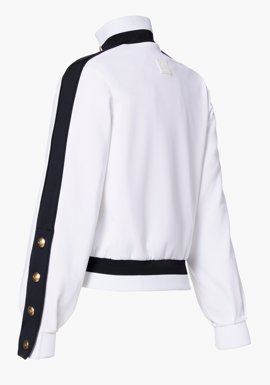 The stylish shortened women's jacket Goldbergh Monaco is characterized by sporty elegance and functionality. The luxurious design inspired by a summer outfit in the spirit of the Côte d'Azur can be perfectly combined with Grimaud trousers, for example. The jacket is made of elastic tracksuit material, which provides maximum comfort and freedom of movement. The classic retro style is complemented by contrasting details with gold buttons on the sleeves and at the waist on the hems. The long zipper and pockets add practicality to the jacket, making it a great casual companion for days spent both in the city and in nature.