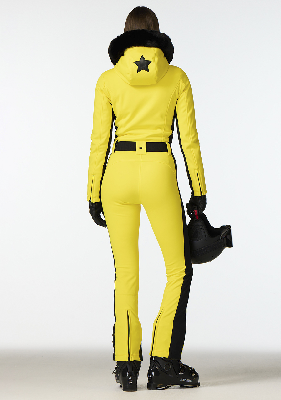 This slim fit ski suit combines modern design with functional features. The filling of certified duck down (RDS) and Primaloft® provides excellent thermal insulation while maintaining lightness. The stretchy lining with antibacterial treatment keeps freshness throughout the day. The suit features four pockets, including a ski pass pocket, two elastic waistbands, zippers on the sleeves and back hem, and a snow gaiter at the bottom. Contrasting panels on the sides made from the outer material emphasize the elegant look. The fixed hood is adorned with a synthetic leather star applique. This model is also available with a fur trim under the code GB016-89/91-254.