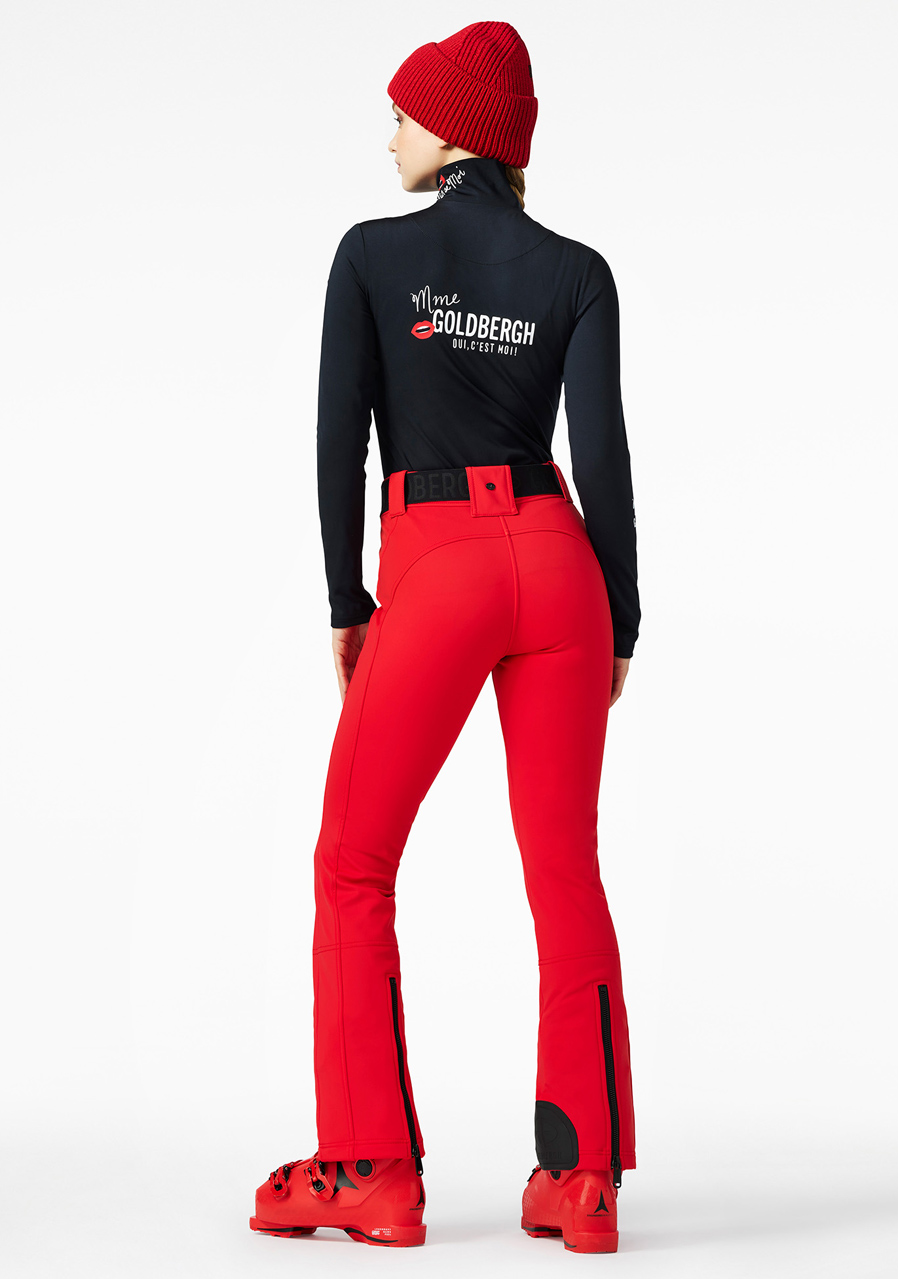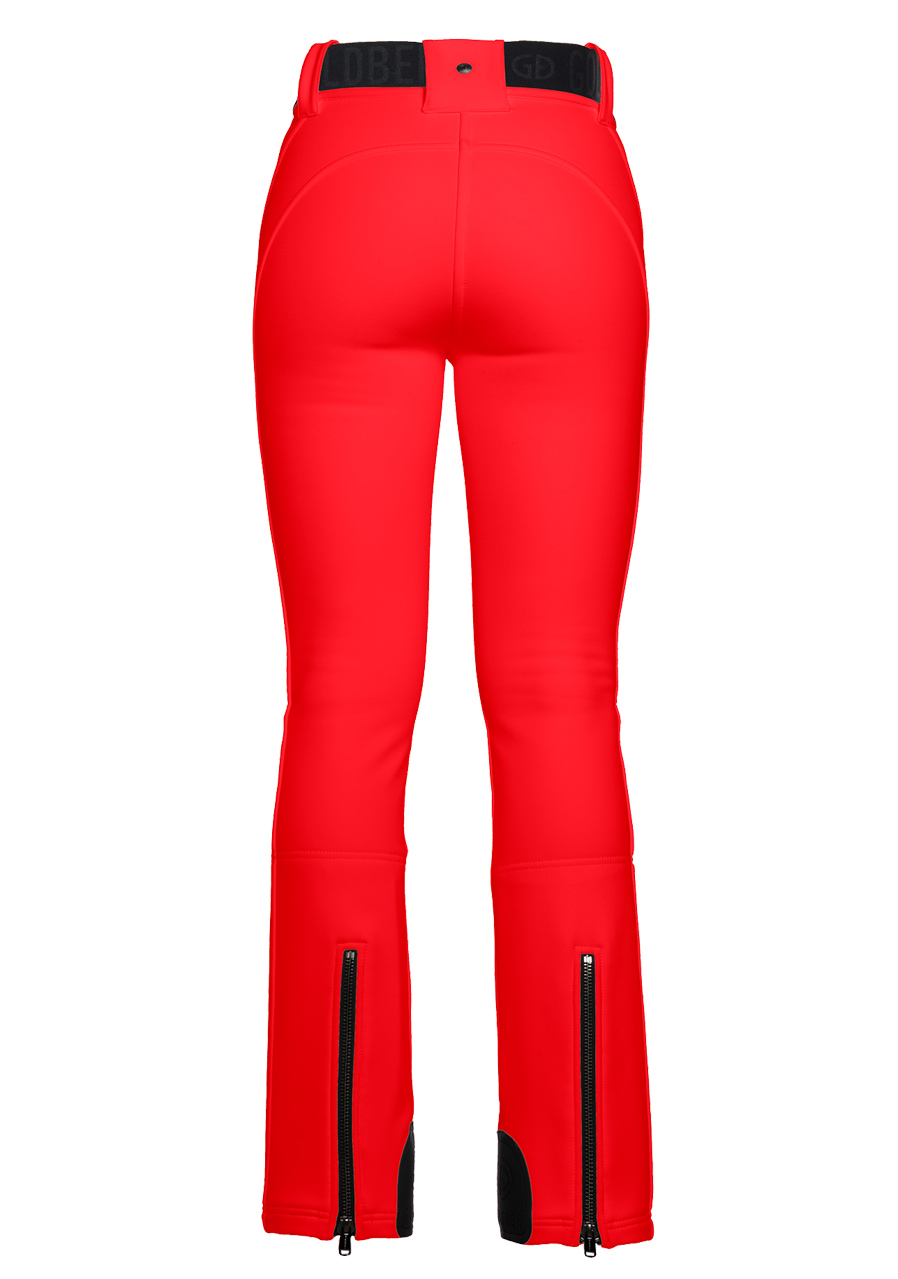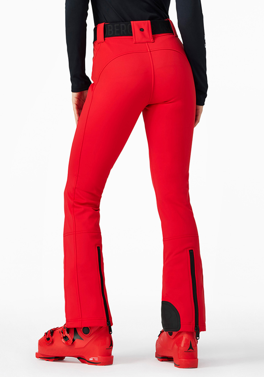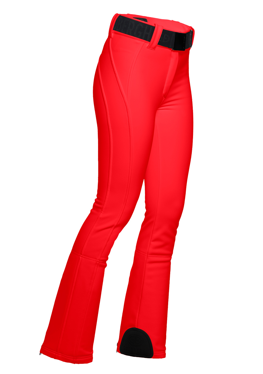 The Goldbergh Pippa Ski Pants in Flame red are the perfect choice for winter sports such as alpine skiing or snowboarding. The 3-layer softshell outer material (WB400 by Schoeller) features a water- and wind-repellent finish, offering excellent stretch and allowing full freedom of movement. The inner lining is made of 100% polyamide with a fleece backing, ensuring added warmth and comfort. These pants have a slim fit and are equipped with snow gaiters and zippers at the back of the legs. A detachable belt adds extra versatility. This model is ideal for those who value both performance and style.