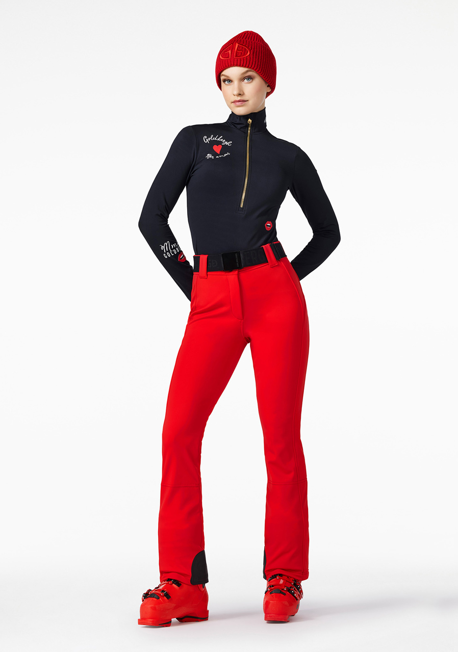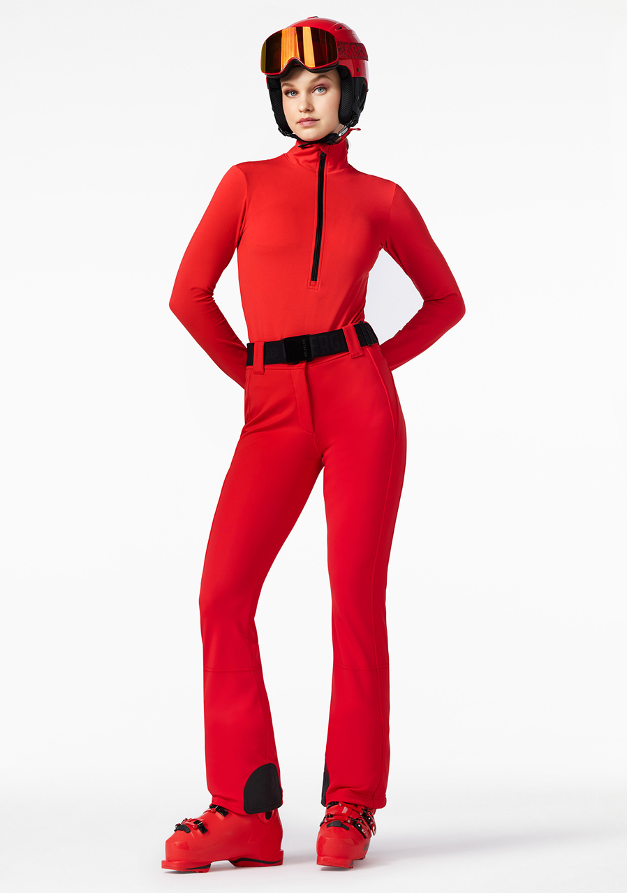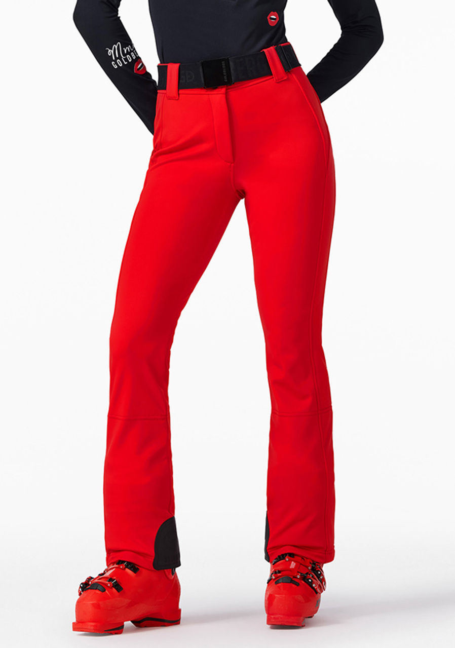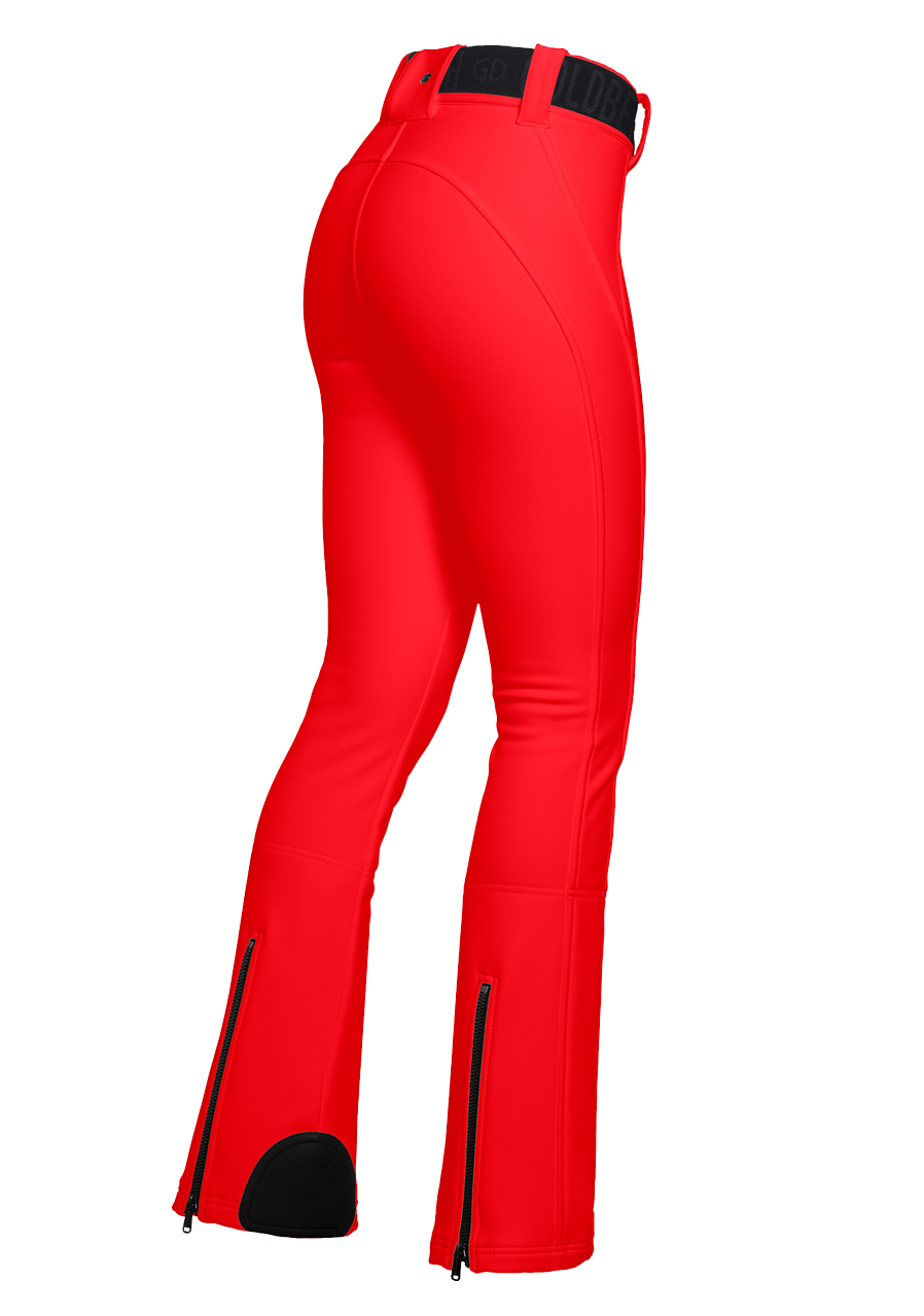 The Goldbergh Pippa Ski Pants in Flame red are the perfect choice for winter sports such as alpine skiing or snowboarding. The 3-layer softshell outer material (WB400 by Schoeller) features a water- and wind-repellent finish, offering excellent stretch and allowing full freedom of movement. The inner lining is made of 100% polyamide with a fleece backing, ensuring added warmth and comfort. These pants have a slim fit and are equipped with snow gaiters and zippers at the back of the legs. A detachable belt adds extra versatility. This model is ideal for those who value both performance and style.