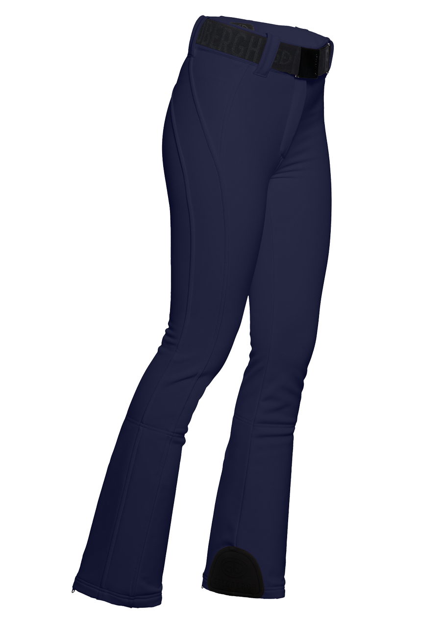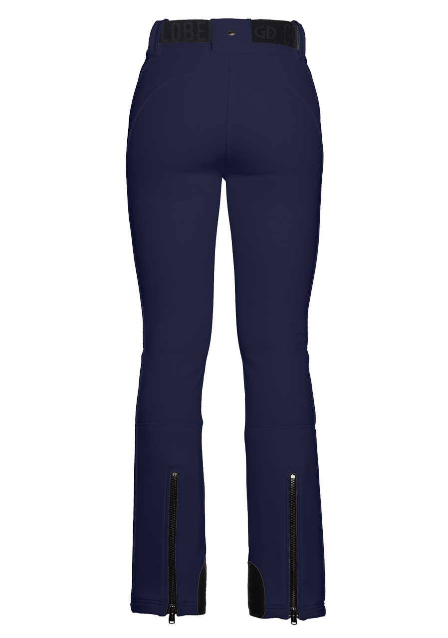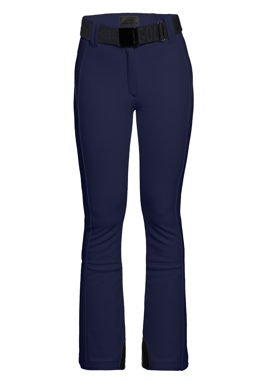 The Goldbergh Pippa Ski Pants in dark navy French Blue are the ideal choice for winter sports such as alpine skiing or snowboarding. Crafted from a 3-layer softshell using WB400 material by Schoeller, the outer fabric is water- and wind-repellent while providing excellent stretch and freedom of movement. The inner lining is made from 100% polyamide with a fleece backing for enhanced warmth and comfort. These slim fit pants are equipped with snow gaiters and zippers on the back of the legs for easy wear with ski boots. A removable belt adds versatility and a touch of style. This model is perfect for those looking for both performance and fashion on the slopes.