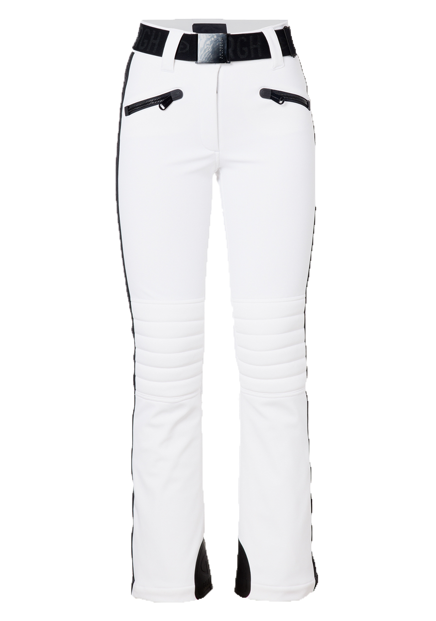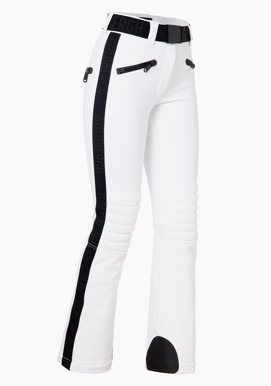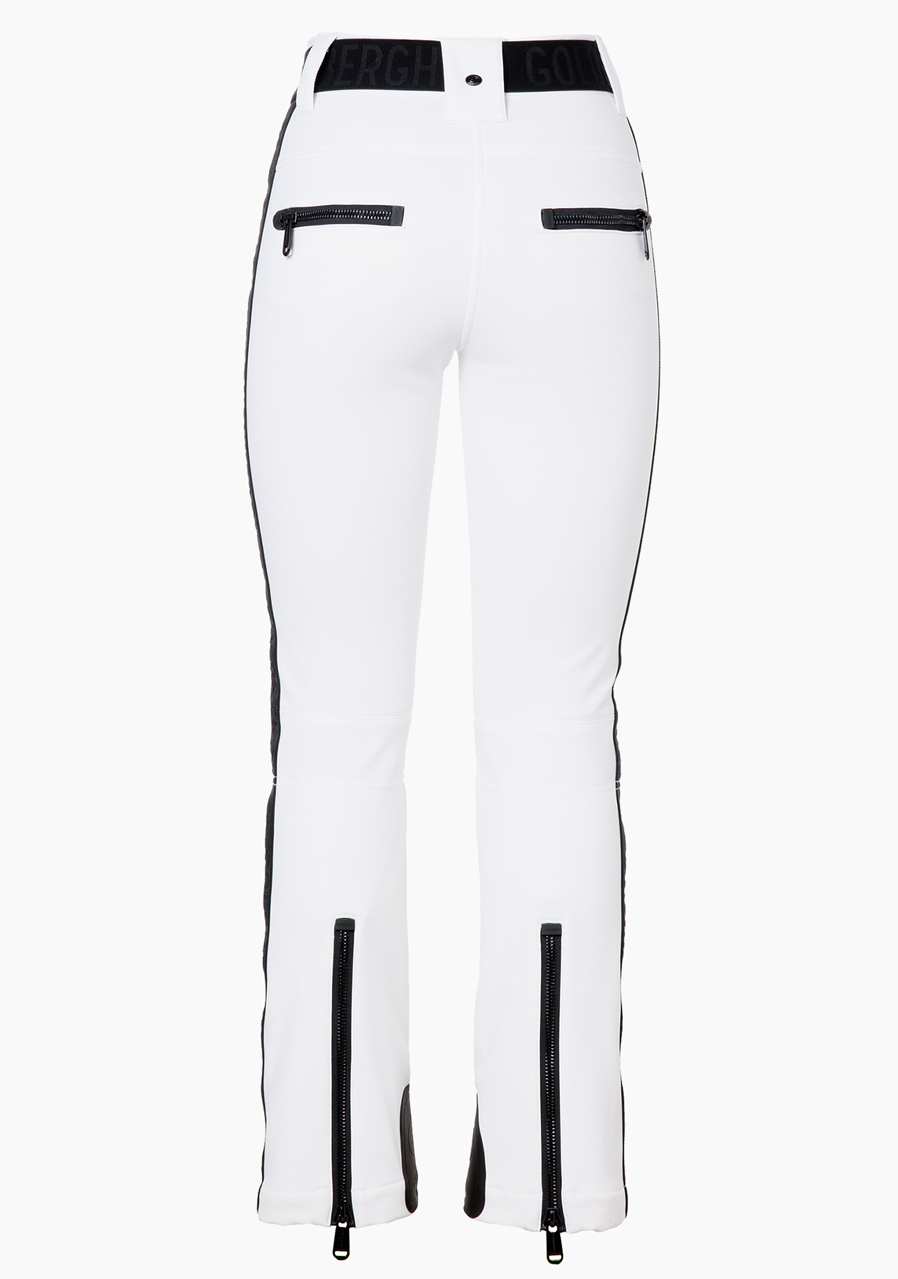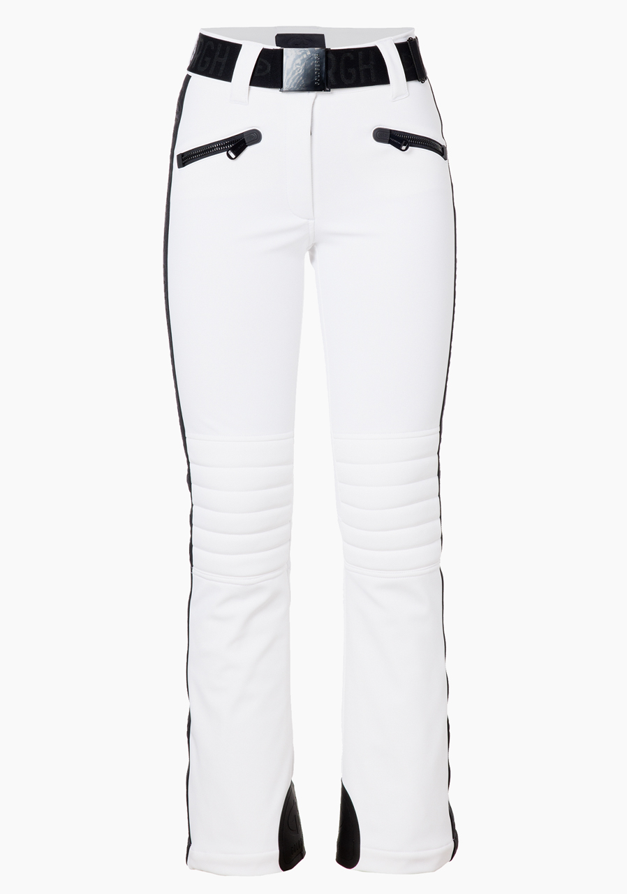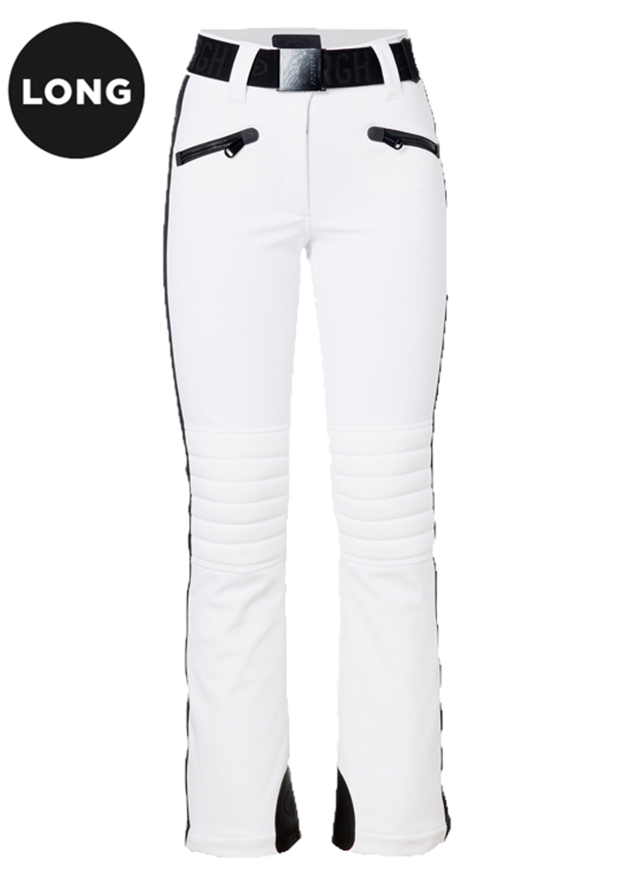 The Goldbergh Slalom Ski Pants in white are luxurious women’s ski pants designed for demanding conditions on the slopes. Made from a blend of polyamide and elastane with Powerstretch technology, they offer excellent freedom of movement while maintaining their shape. This is the extended (LONG) version. The pants are waterproof and breathable, ensuring comfort even during intense activity. They feature a slim fit, high waist for better protection against the cold, and an adjustable belt. Practical details include zippers at the leg ends for easy donning over ski boots and integrated snow gaiters to prevent snow ingress. The pants also have four zippered pockets and special padding at the knees. These pants are an ideal choice for women seeking both functionality and style on the slopes.