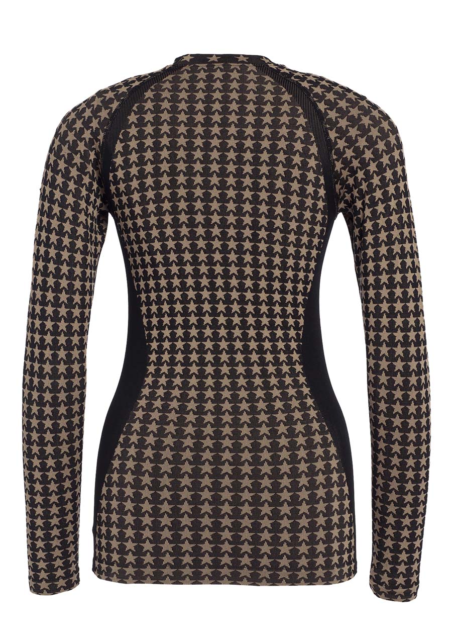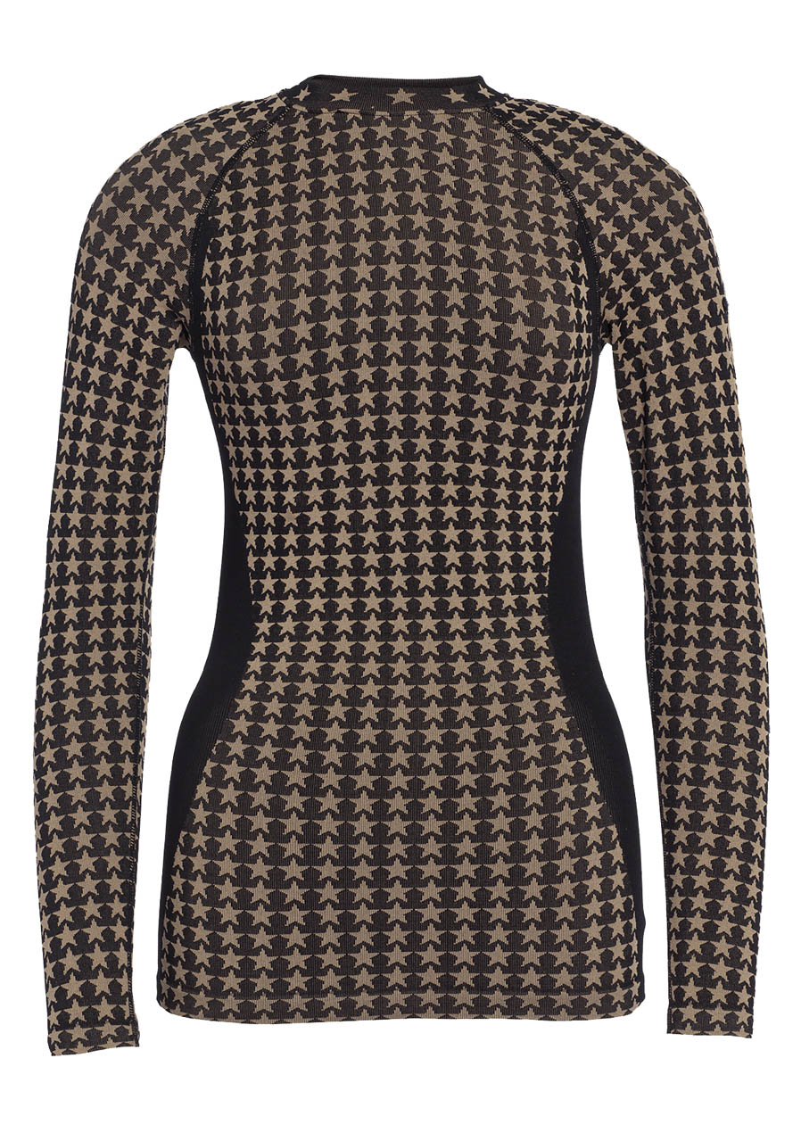 Parameters: Material: Seamless knit, moisture-wicking, quick-drying, and antibacterial Composition: 61% polyamide, 32% polyester, 7% elastane Fit: Slim fit, size corresponds to standard sizing Neckline: Round Sleeves: Long Length: 62.5 cm from center back (size S-M) Brand: All-over star pattern, metal label on upper sleeve