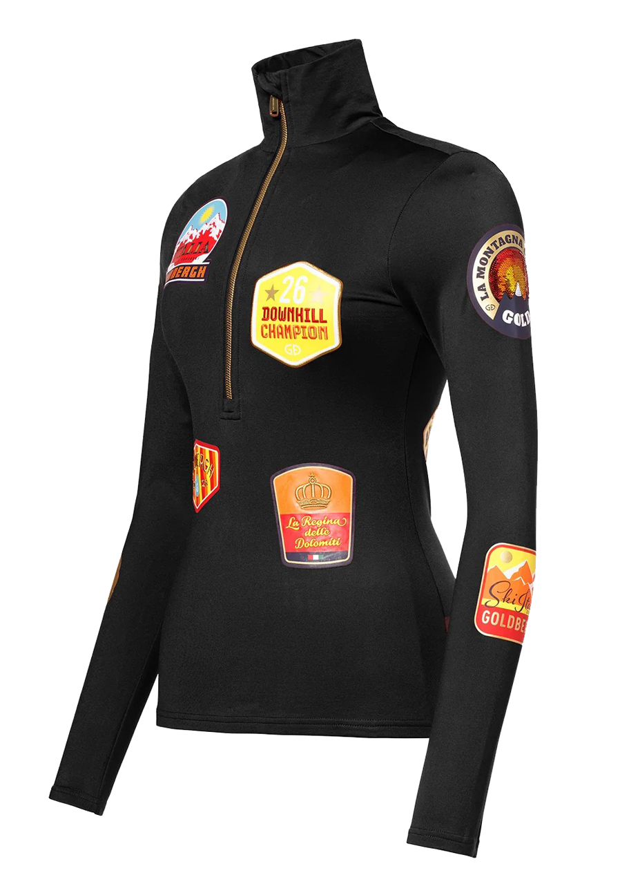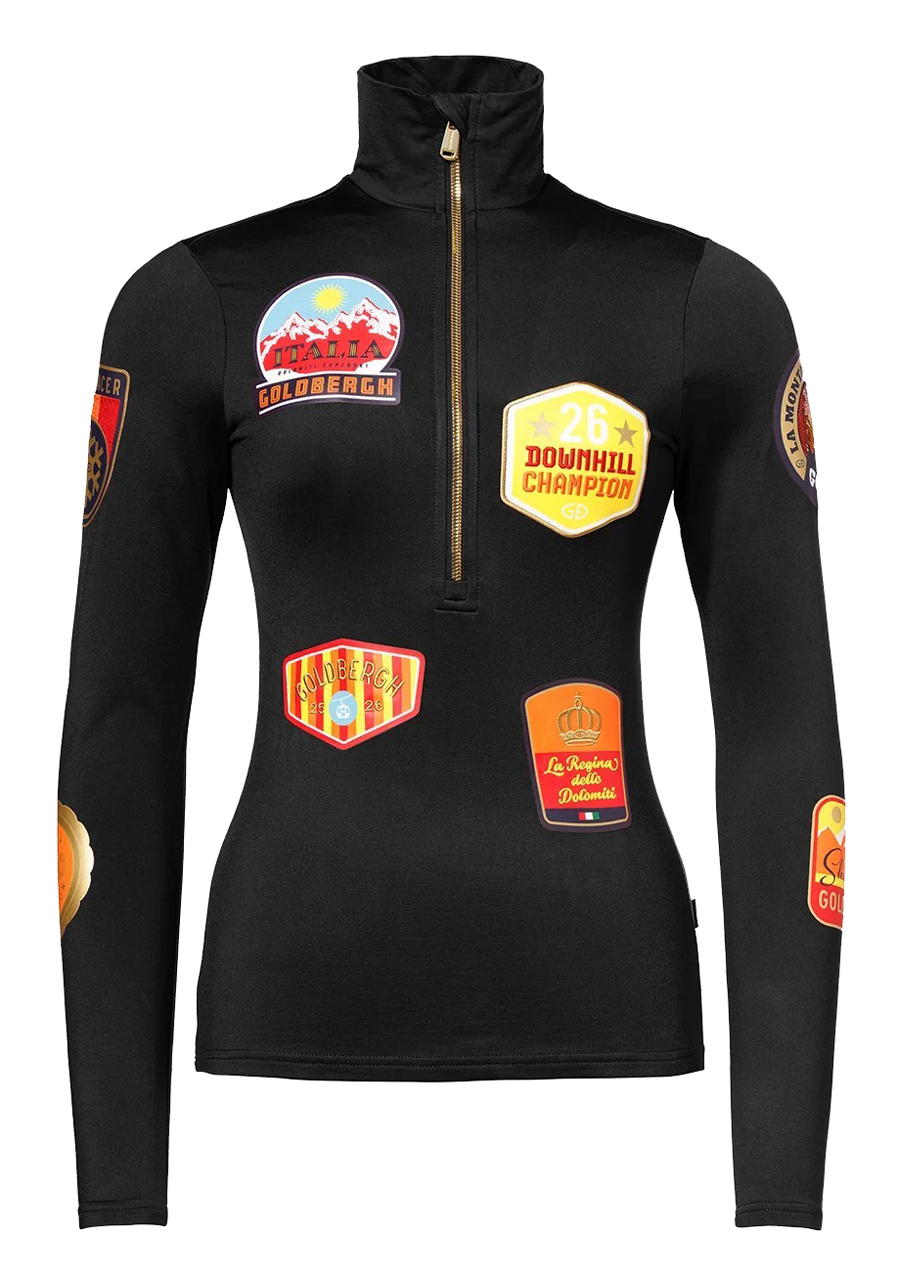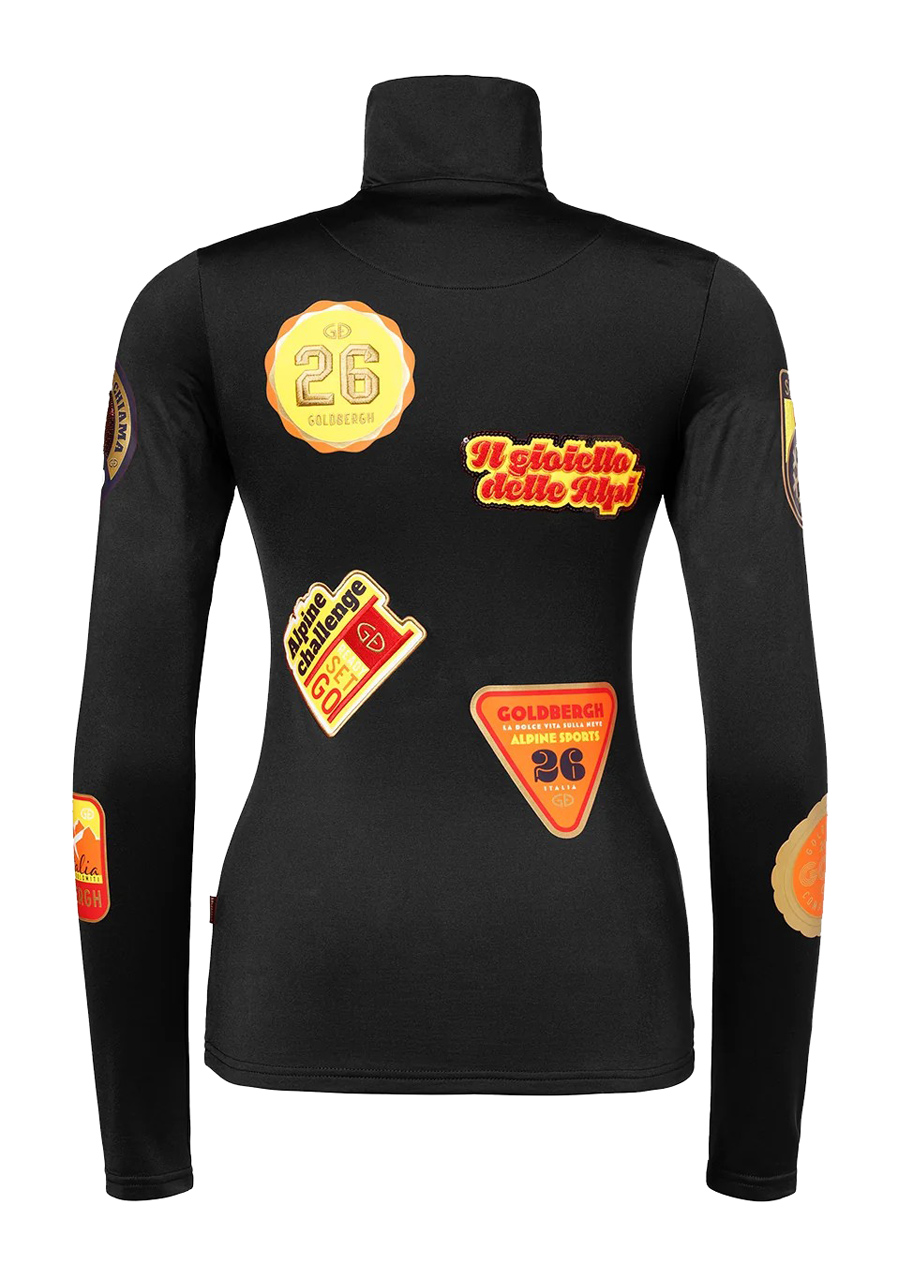 This slim-fit top is made from stretch jersey with a soft brushed back, providing comfort and warmth. The model features a narrow stand-up collar, an extended half-zip, and is decorated with all-over printed graphics and embroidered badges for a stylish look. Thanks to the quick-drying fabric with moisture management and anti-odor treatment, this top is ideal for winter sports as well as leisure activities.
