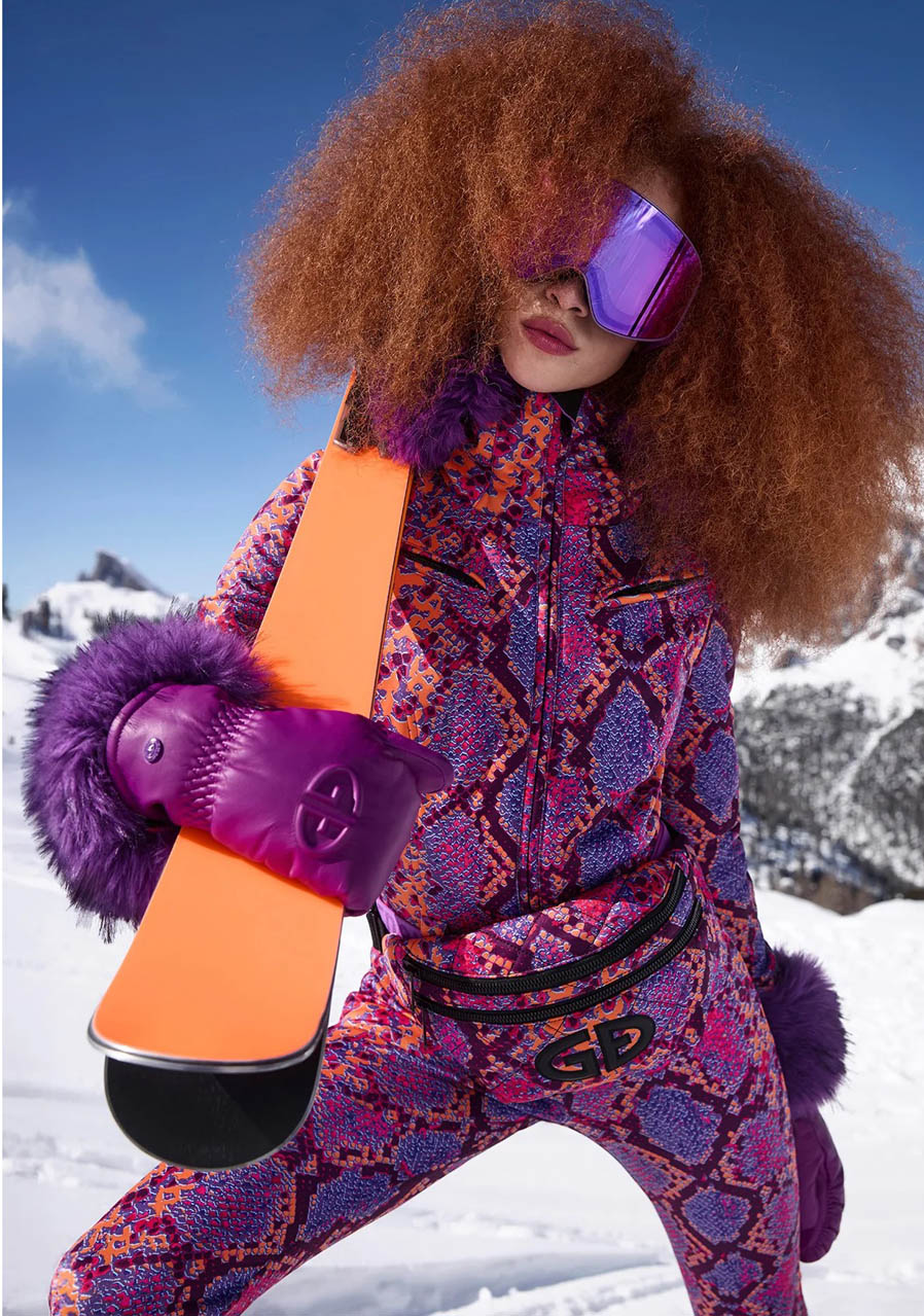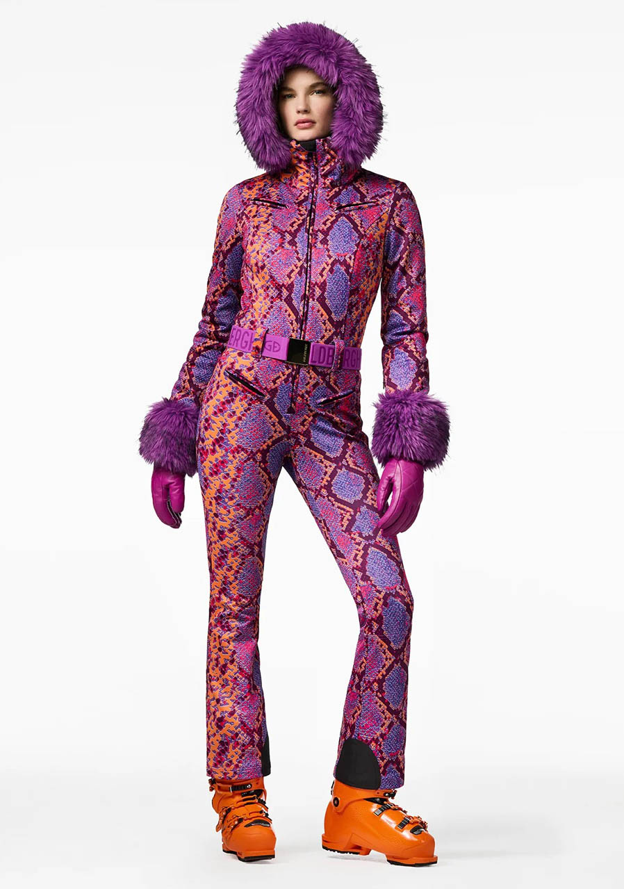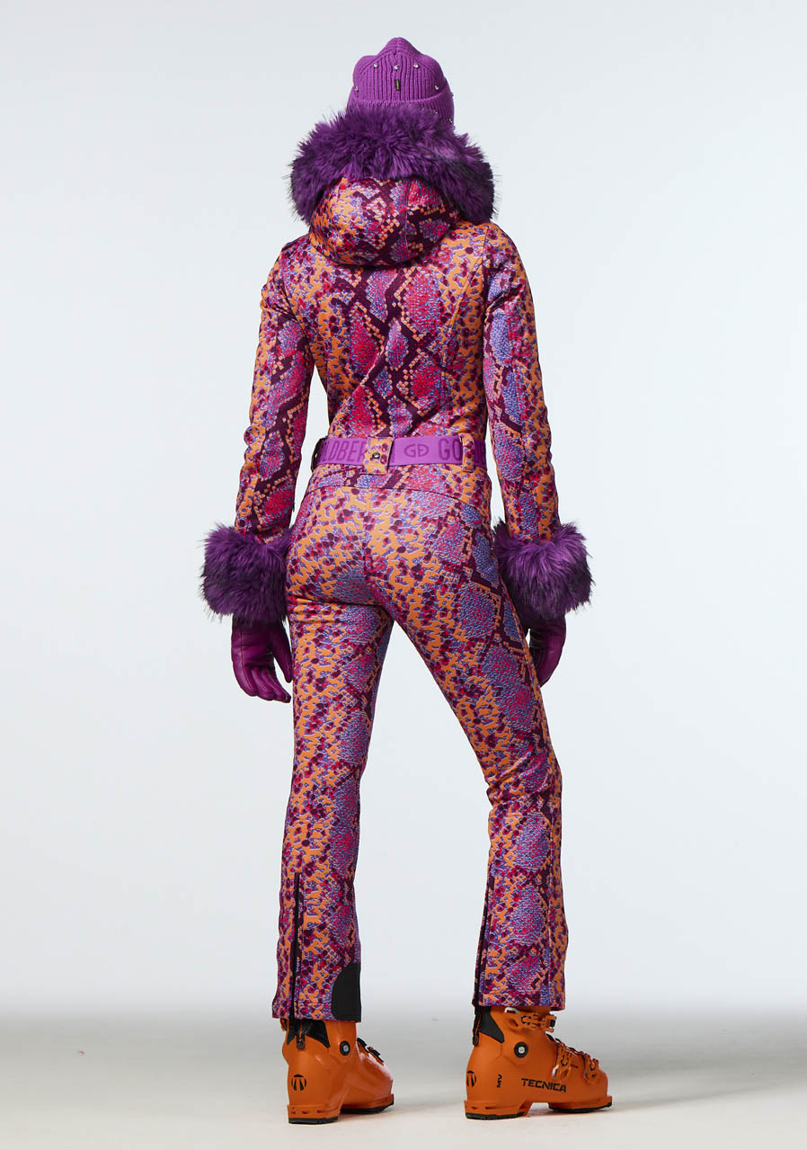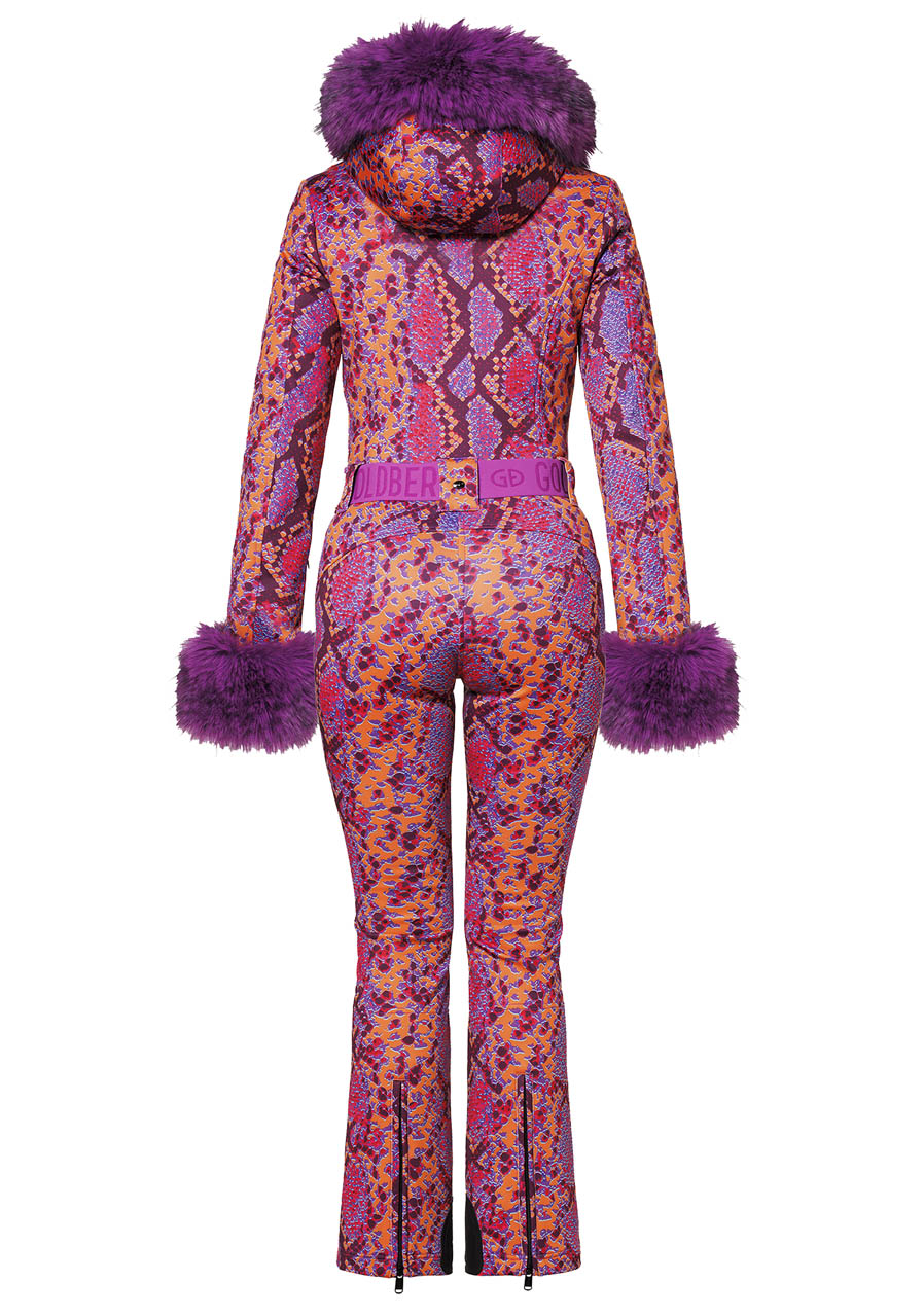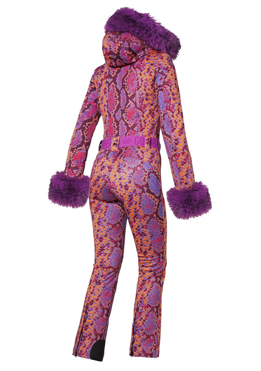 This women's ski suit in a slim fit cut perfectly balances functionality and modern style. The blend of certified down and Primaloft® insulation ensures excellent thermal comfort while allowing full freedom of movement. Practical features such as a ski pass pocket, snow cuffs, elastic belts, and a stretch lining with antibacterial finish provide maximum comfort during sports activities. This model is also available with a faux fur trim and cuffs under code GB029-91-254.