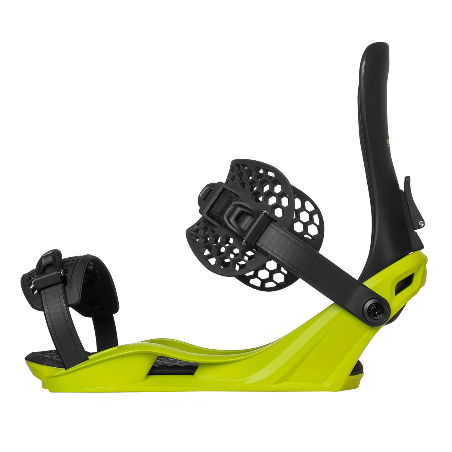 Parametry: Design: Moderní barevná kombinace lime/black, která přitahuje pozornost a skvěle ladí s většinou snowboardových setů. Spojení s boardem: Silné a odolné konstrukce pro vynikající přenos síly a optimální výkon. Pohodlí: Anatomicky tvarované strapy, které zajišťují maximální komfort i při dlouhých dnech na svahu. Flex: Střední flex (6/10), ideální pro všechny typy jezdců, kteří hledají rovnováhu mezi flexibilitou a podporou. Přizpůsobení: Možnost snadného nastavení pro různé velikosti bot, čímž zajišťuje komfortní a stabilní fit.