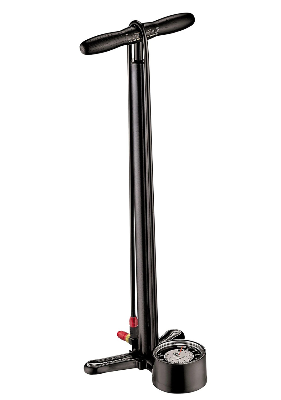 Elegant workshop floor pump with classic looks and premium build quality. Steel barrel, aluminum base, and wooden handle provide durability and comfort. Equipped with a precise analog pressure gauge and ABS1 Pro head compatible with all valve types. Sleek metallic black finish.