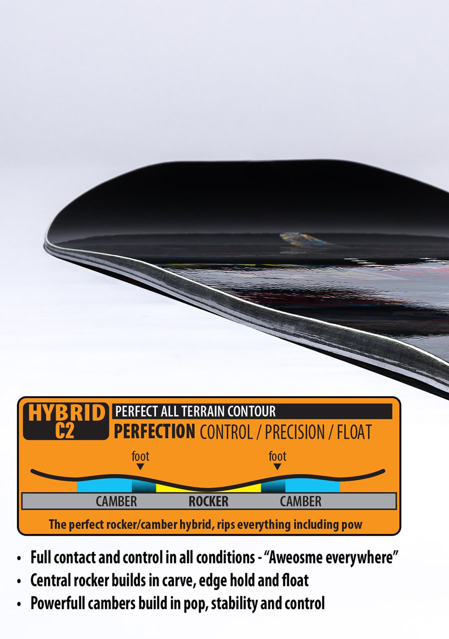 Parameters: Type : All-Mountain / Freestyle / Freeride Intended for : unisex, advanced to expert Profile : C2 Hybrid (camber/rocker combination) Hardness : medium to stiffer (medium-stiff flex) Edges : Magne-Traction® – maximum grip on ice Core : Horsepower (HP) – lightweight ecological core made of paulownia, basswood and birch Base : Eco Sublimated Sintered Base – extremely fast and durable Lamination : Triax/Biax with basalt fibers Protection : UHMW sidewalls, toe and heel reinforcements Designed for : performance all-mountain and freestyle riding Made in the USA