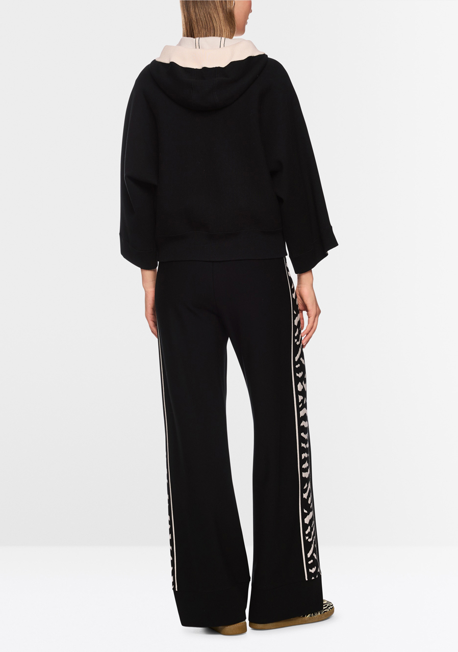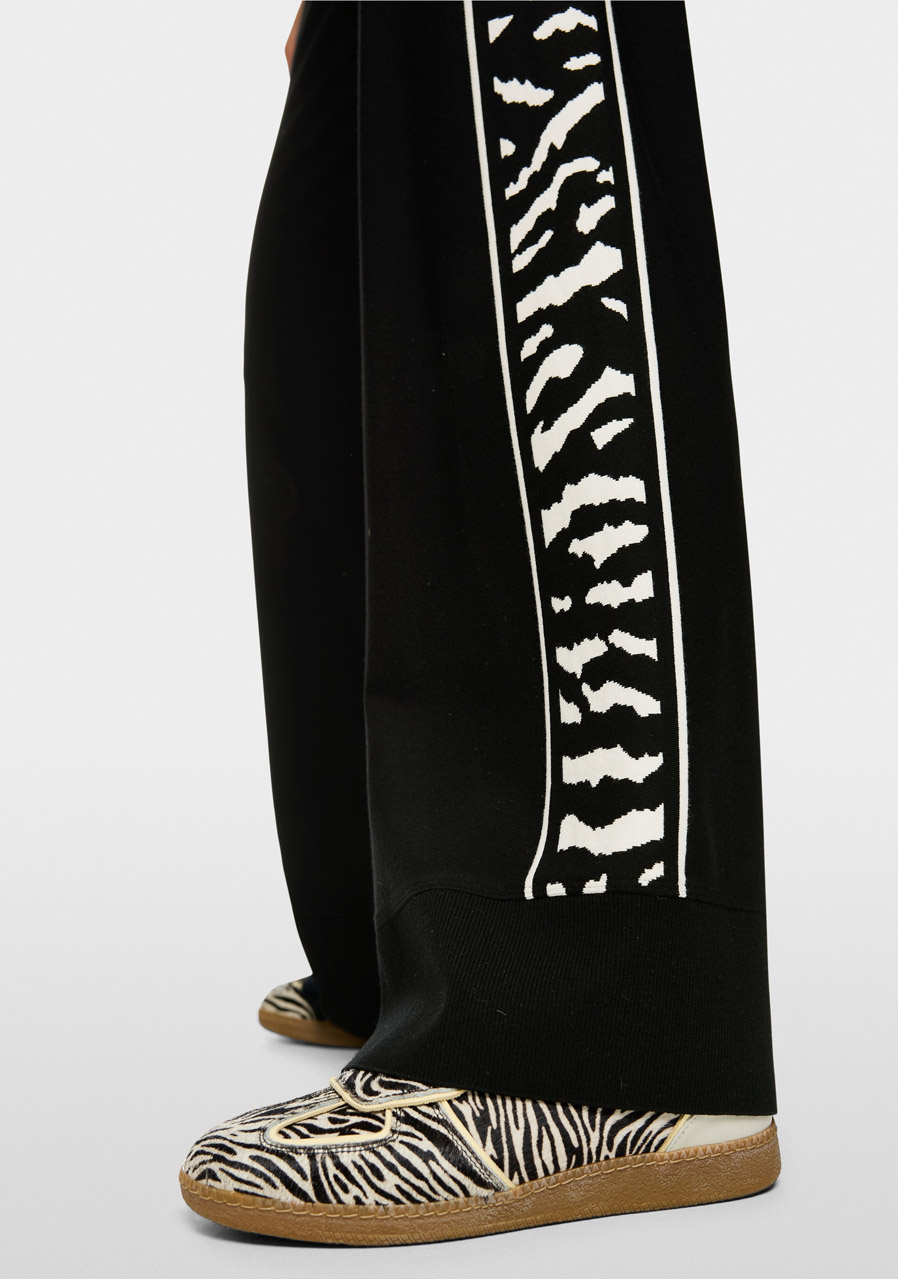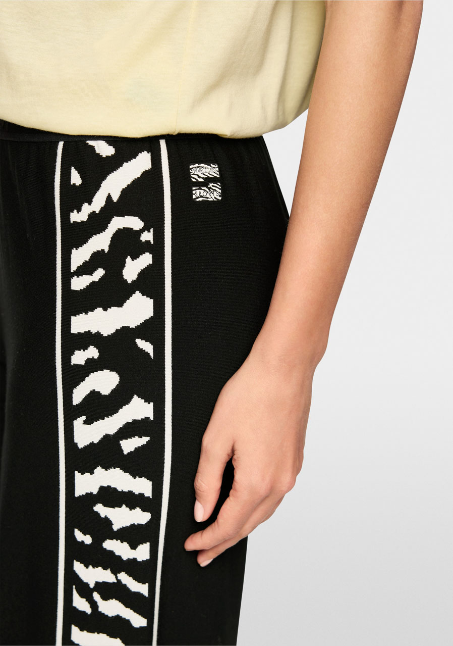 Parameters: Material 70% viscose, 30% polyester Wide cut Elastic waist Long pants , wide, length 81 cm Modern style , comfortable Details: wide side stripe with animal print, knitted cuffs on the hem Sustainability Rethink Together , Knitted in Germany Model height 179 cm , size N3/38