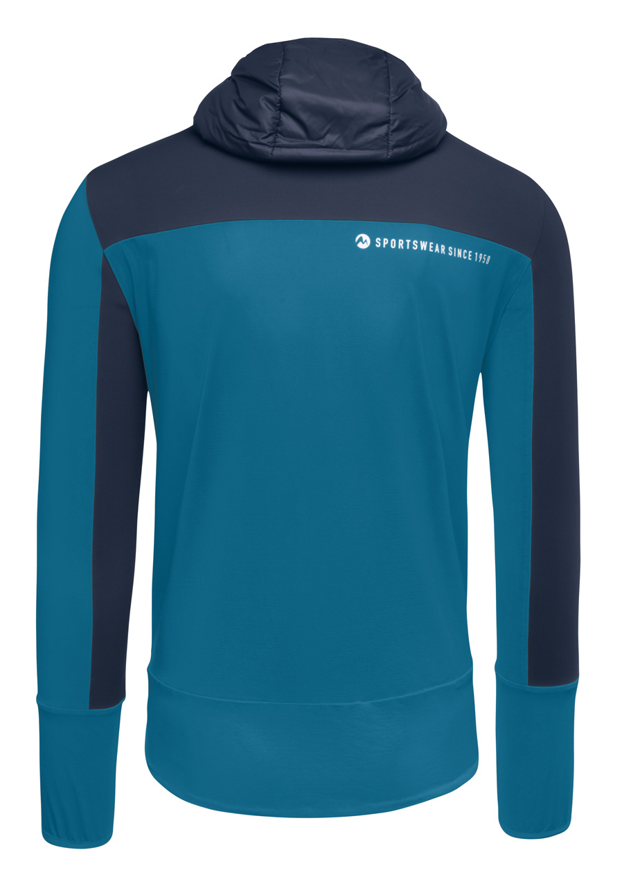 The Martini No Limit He men’s hybrid jacket in the color combination insignia/true navy is a versatile choice for sporty men seeking uncompromising functionality. This jacket combines lightweight stretch fabric with a warm front panel made from Primaloft® Gold (40 g), delivering optimal thermal comfort without restricting movement.