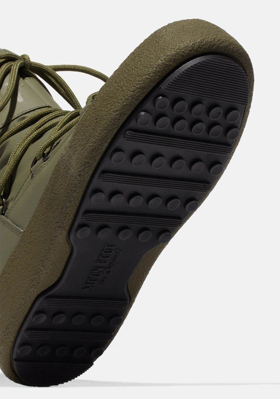 Men's winter boots Moon Boot Mtrack Tube Rubber in khaki design 003 Khaki combine urban style with functionality for the winter season. The robust rubber upper with water-repellent treatment reliably protects against snow and moisture, while the warm lining with insulation keeps feet warm even on frosty days. The higher cut provides stability and protection, and the rubber sole with an anti-slip pattern ensures a sure step on snow and ice. Perfect shoes for everyday wear in a winter city or for weekend trips to nature.