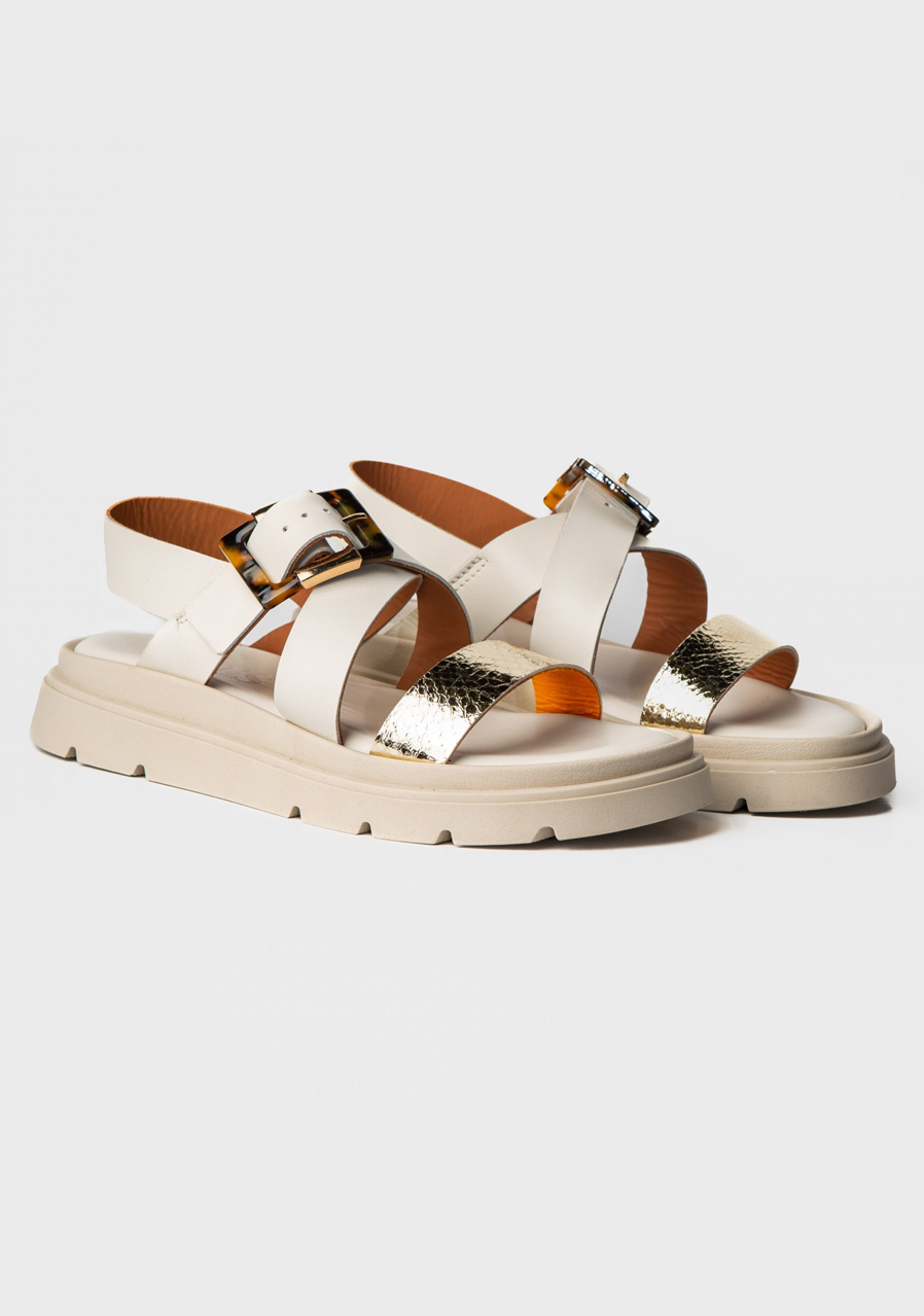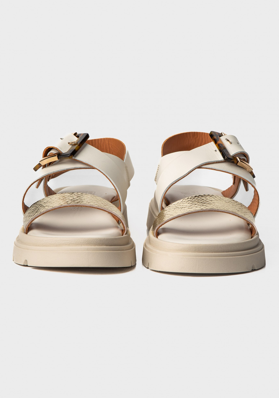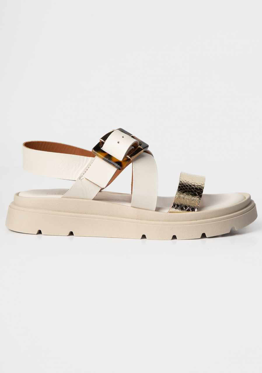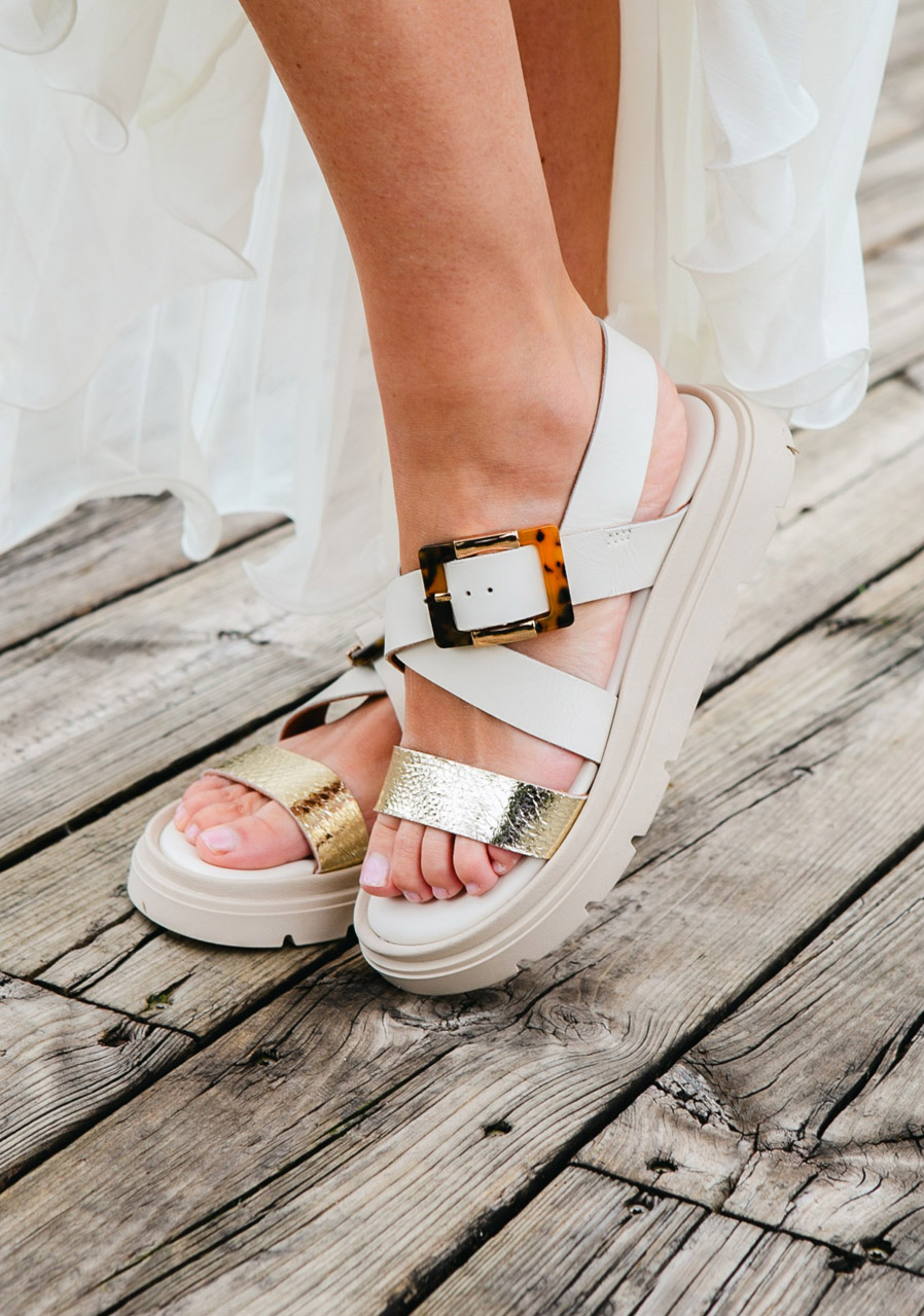 These stylish sandals in creamy white with an elegant gold buckle are the perfect addition to summer outfits. The minimalist design highlights the luxurious look of genuine leather, while the comfortable cut ensures comfort during all-day wear. Ideal for dresses, skirts and light trousers, whether in the city or on vacation.