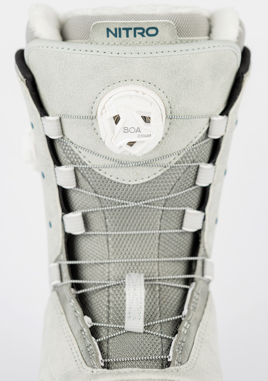 The Nitro Crown Boa snowboard boots in Light Grey are designed for female riders looking for reliable comfort and precise snowboard control. The Boa system makes tightening quick and even, so the boots fit securely and comfortably. The soft to medium flex supports versatile use from downhill to freestyle to all mountain riding. The inner liner adapts to the shape of the foot and ensures stability and thermal comfort all day long.