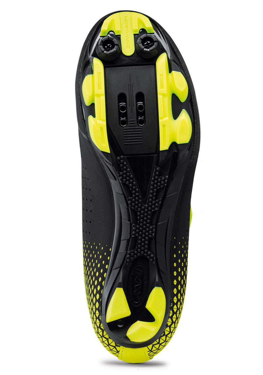 The men's Northwave XC shoes feature a three-layer Speedlight 3D sole. The seamless unibody construction with a breathable design minimizes unwanted pressure points, and ventilation zones ensure a steady flow of fresh air. The closure is handled by the Northwave SLW3 dial system, offering precise tightening and loosening with a single finger, complemented by a lower power strap with Velcro fastening. The shoes use ultra-strong Dyneema fiber cables for maximum durability and reliability.