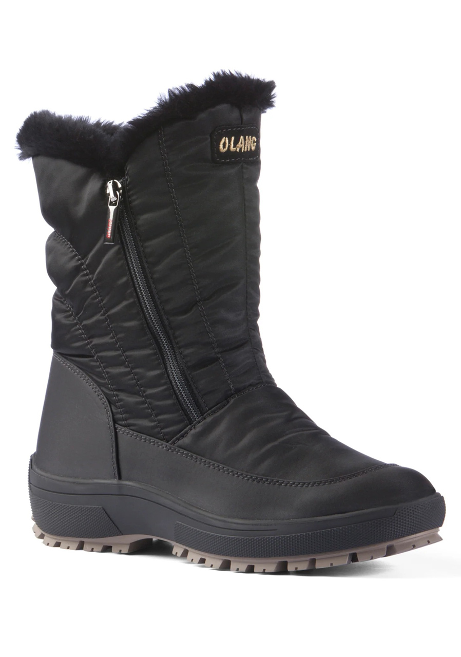 The Olang Monica OC.TEX 81 Nero is a women’s winter boot designed for urban use and light snow walking. It offers warmth, weather protection, and elegant styling. The upper is made from synthetic material and features a waterproof OC.TEX membrane for moisture resistance. Inside, a faux fur lining provides insulation. The outsole is equipped with the OC System®, allowing flip-out steel grips for added traction on icy terrain. Intended use: women’s winter urban and walking footwear Upper: synthetic with OC.TEX waterproof membrane Insulation: warm faux fur lining Outsole: OC System® with fold-out metal grips Closure: traditional lacing Color: black (Nero 81)