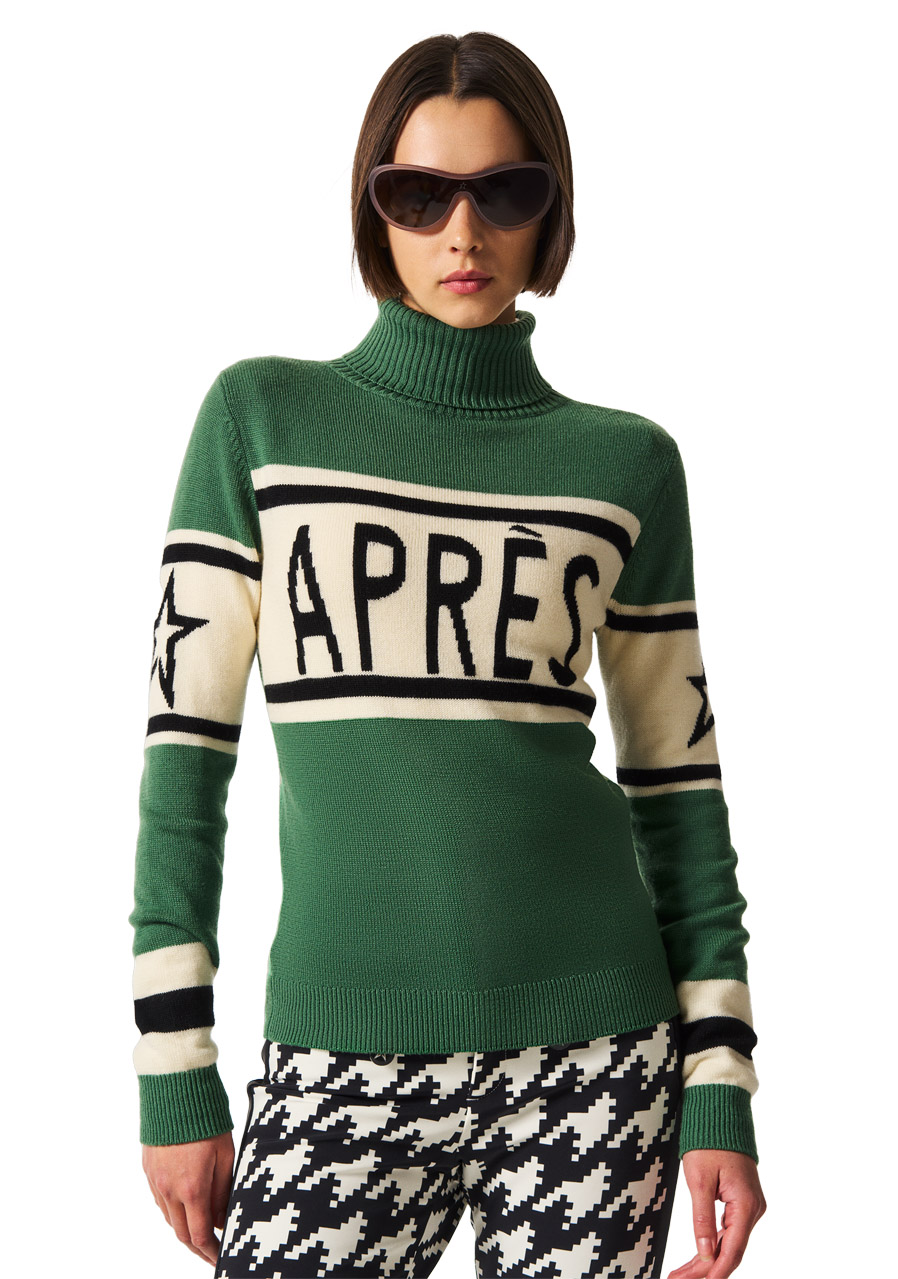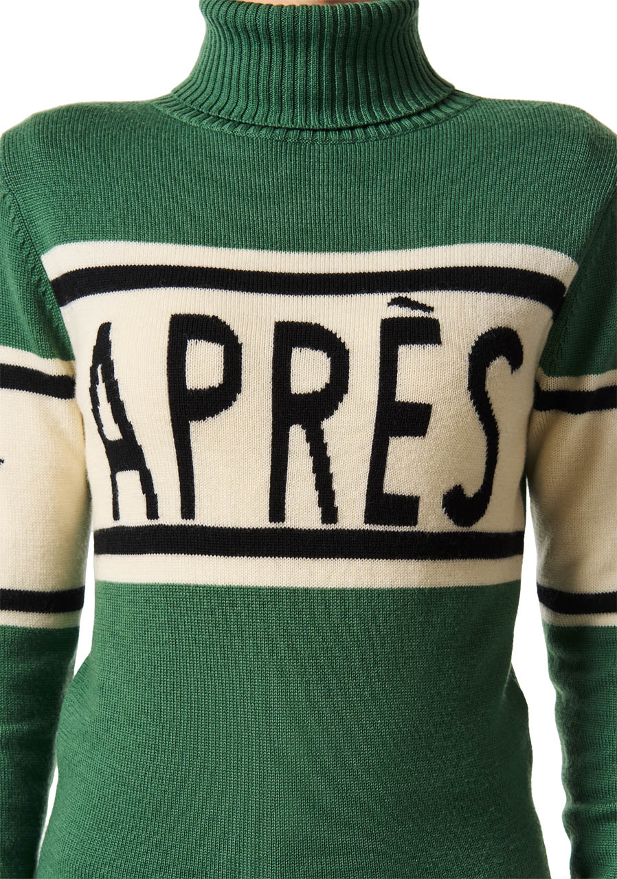 Parameters: Material : 100% merino wool Cut : fitted, waist length Collar : ribbed turtleneck Sleeves : long, with ribbed cuffs Design : inlaid "Après" inscription on the front Properties : warm, breathable, thermoregulatory, naturally antibacterial
