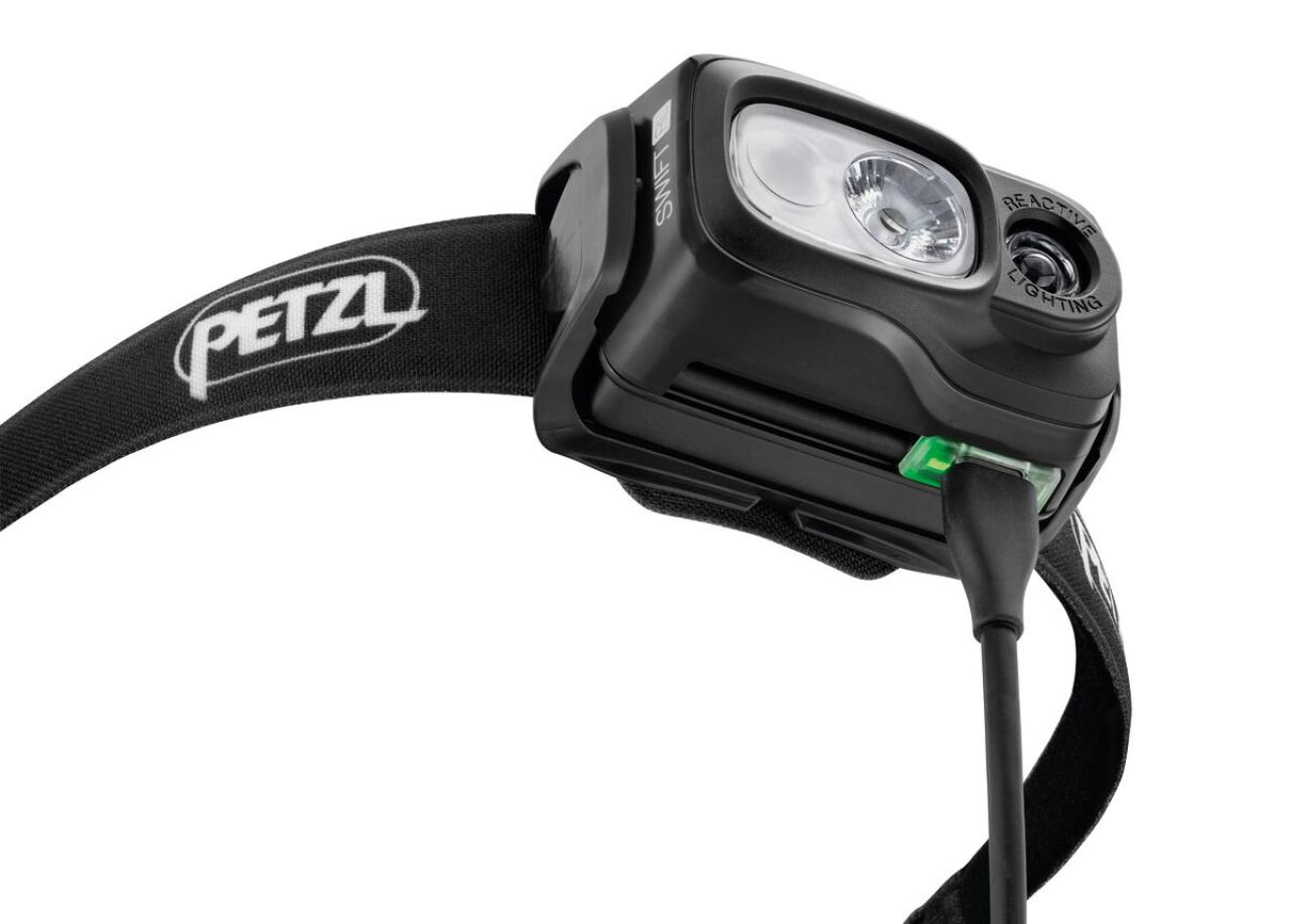 REACTIVE LIGHTING and CONSTANT LIGHTING technologies - light output up to 900 lumens - beam distance up to 150 meters - runtime up to 100 hours - red light for night vision - rechargeable Petzl Accu Swift RL battery with micro USB - charging time approximately 6 hours - battery status indicator - water resistance IPX4 - weight 100 g - color: black.