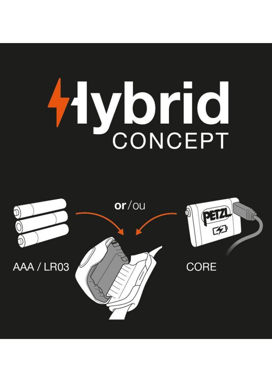 HYBRID CONCEPT technology - light output 350 lumens - beam distance up to 70 meters - runtime up to 120 hours - red light mode - easy one-button operation - powered by three AAA batteries (included) or Petzl CORE rechargeable battery - weight 94 g - water resistance: IPX4 - color: black.