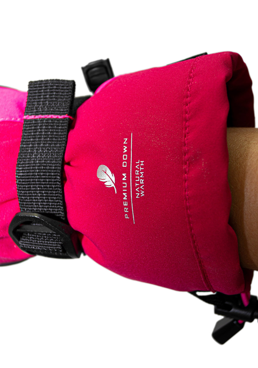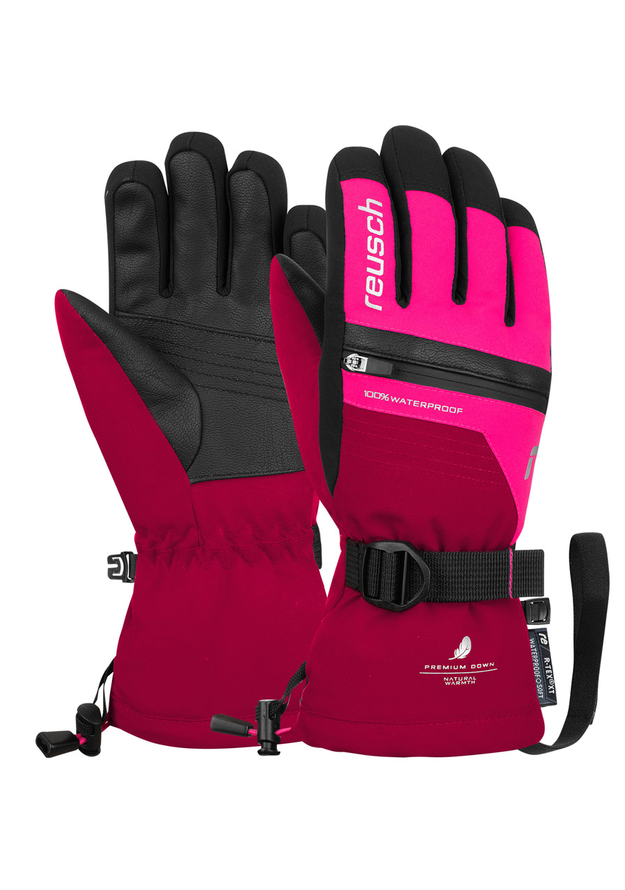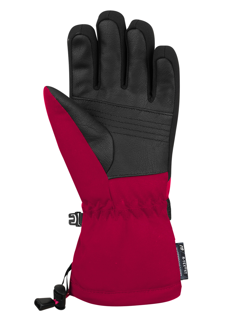 Parameters: Outer material : 85% polyester, 15% polyurethane Palm : 100% polyurethane Lining : 100% polyester Membrane : R-TEX® XT – waterproof, windproof, breathable Insulation : TecFill™ – warm synthetic filling Cuff : extended with loop for easy donning Features : waterproof, windproof, warm, durable Color : Cerise/Pink Glo (3347) Style : children's, sports