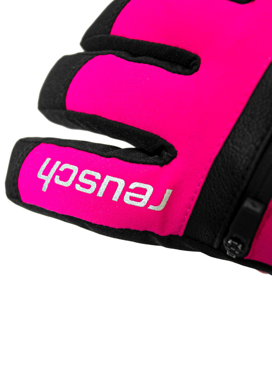 The Reusch Lando R-TEX® XT Junior children's gloves in the playful Cerise/Pink Glo color combination offer great functionality, durability and thermal comfort for little skiers and snowboarders. Thanks to the R-TEX® XT membrane, the gloves are fully waterproof, windproof and breathable, keeping children's hands warm and dry all day on the slopes. The warm TecFill™ insulation provides excellent thermal protection, while the soft lining ensures a pleasant feeling when wearing. The durable outer material, reinforced palm and long cuff with loop ensure a perfect fit and easy dressing.