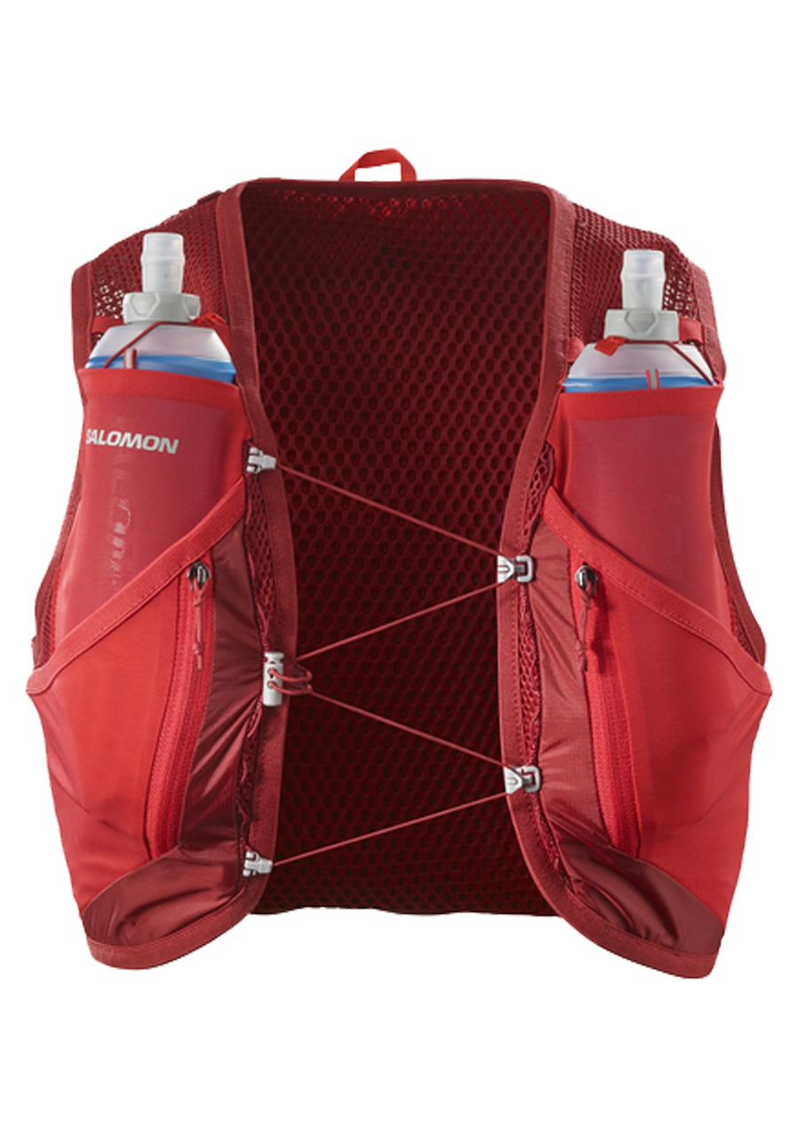 The Salomon Active Skin 12 Set running vest in the attractive Red Dahlia/High Risk colorway is the perfect companion for runners who demand comfort, functionality and style. Designed with lightness and ergonomics in mind, it offers maximum freedom of movement during training and races. The set includes two hydration bottles