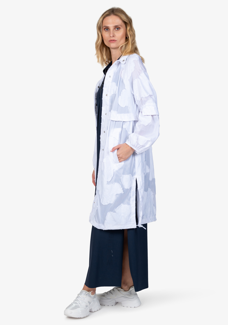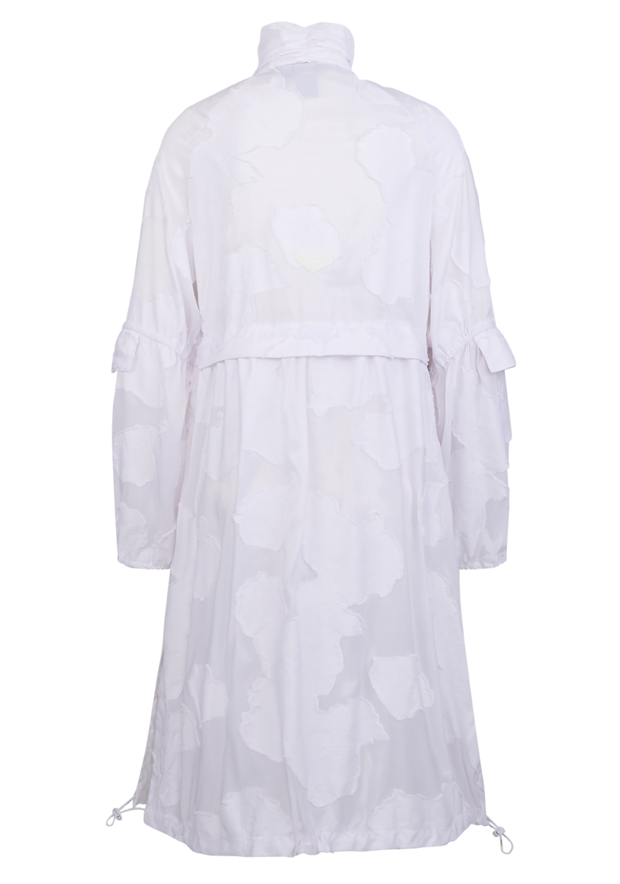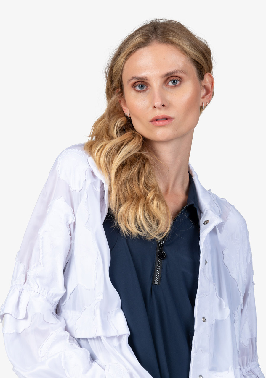 Materiál: 100% polyamid Délka zad pro velikost 36: 103,3 cm Další parametry: 3D květinový vzor, přiléhavý střih, extravagantní ženský styl, stojáček s řasením, raglánové rukávy s řasením, na loktech přišitou klopou, lem rukávů s úzkou gumičkou, panel s druky uprostřed, lemované kapsy, Řasení v pase, vysoké boční rozparky stahovací šňůrka s gumičkou v lemu.