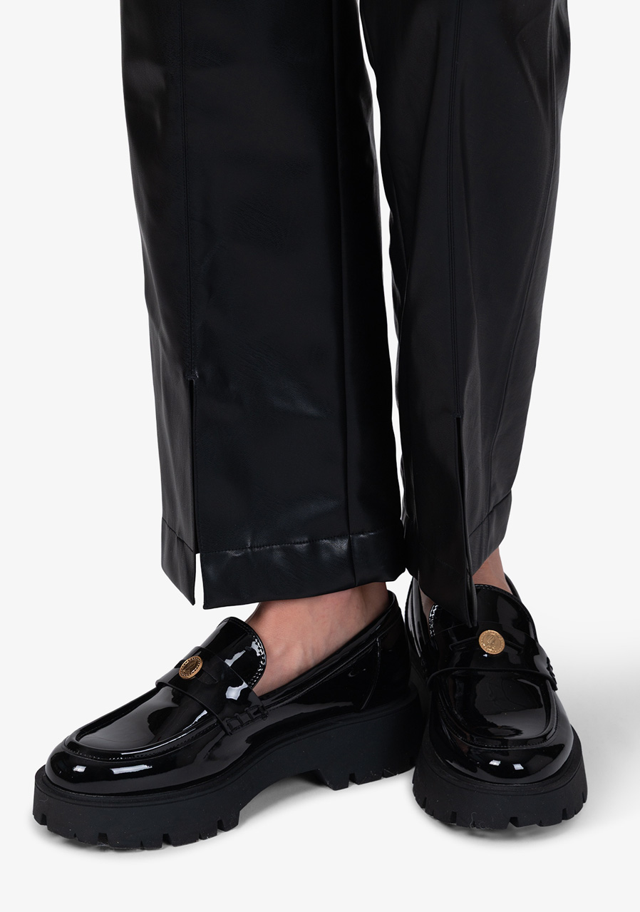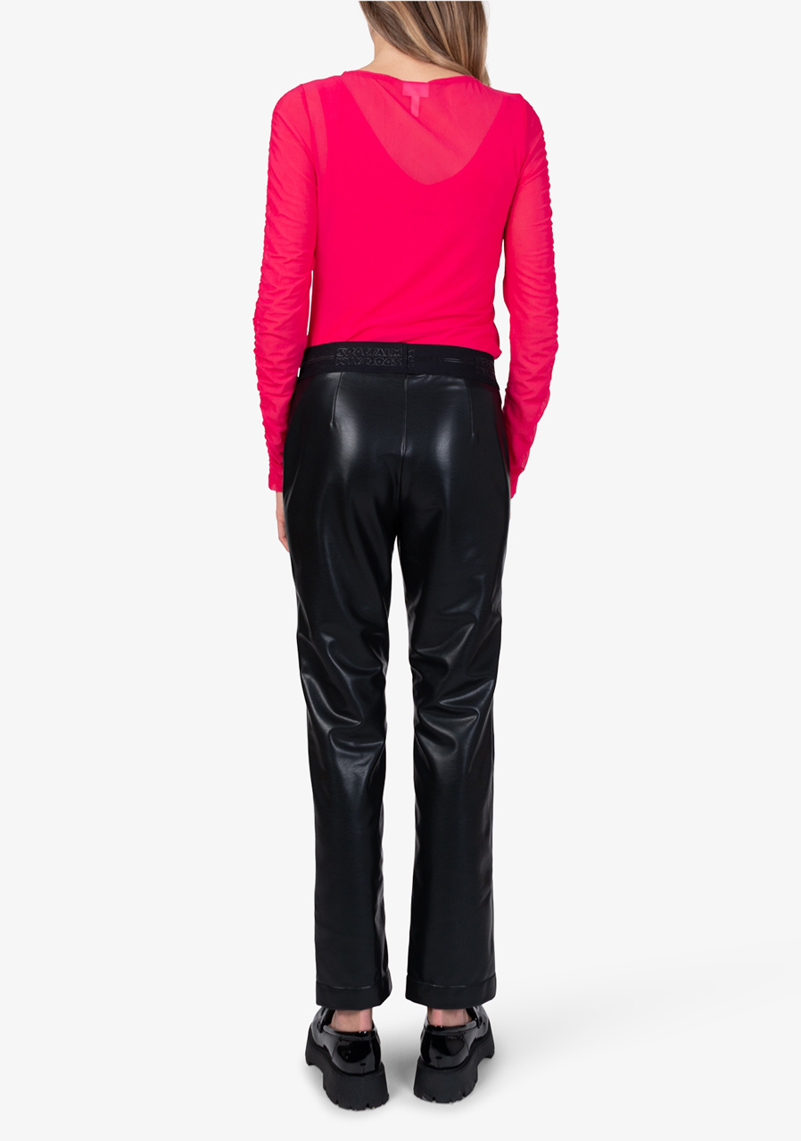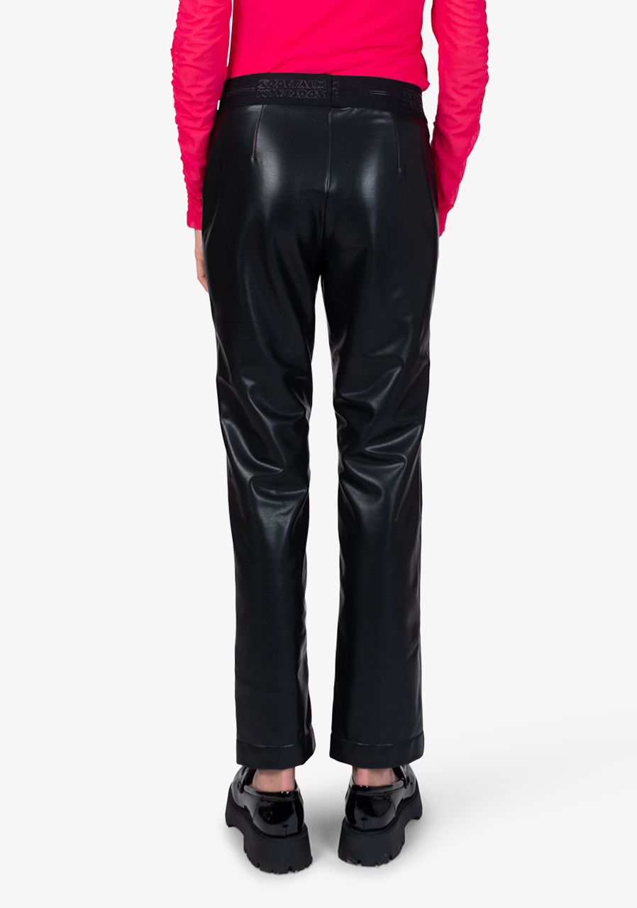 These trousers in smooth imitation leather impress with their sophisticated look and precise cut that gently follows the silhouette. The elegant lines are complemented by subtle details, making them the ideal choice for stylish, refined outfits. The soft elastic waistband ensures comfort when worn, while the straight legs with subtle pleats look timeless and elegant. A short slit at the front hem and a subtle Sportalm inscription on the waist add a modern accent.