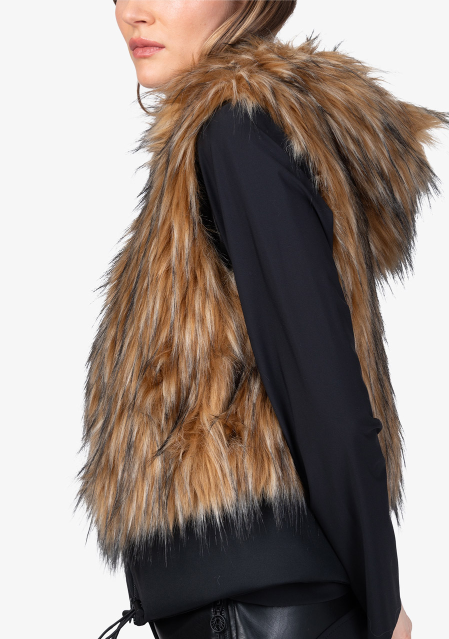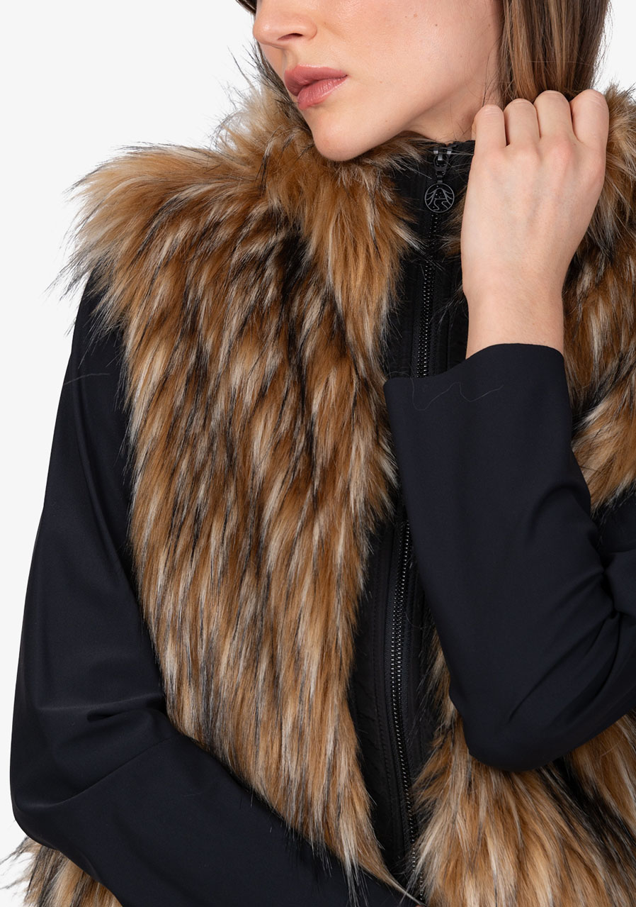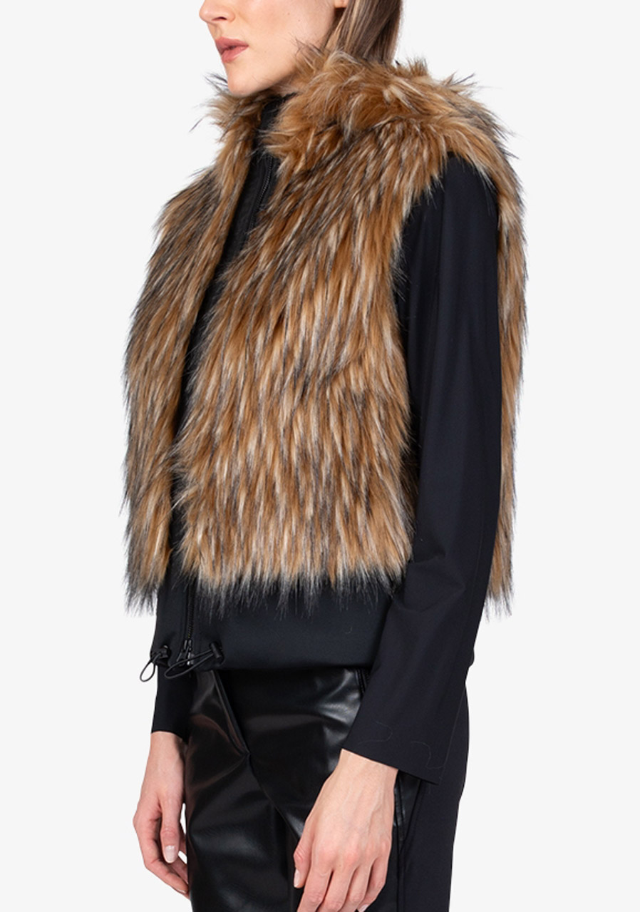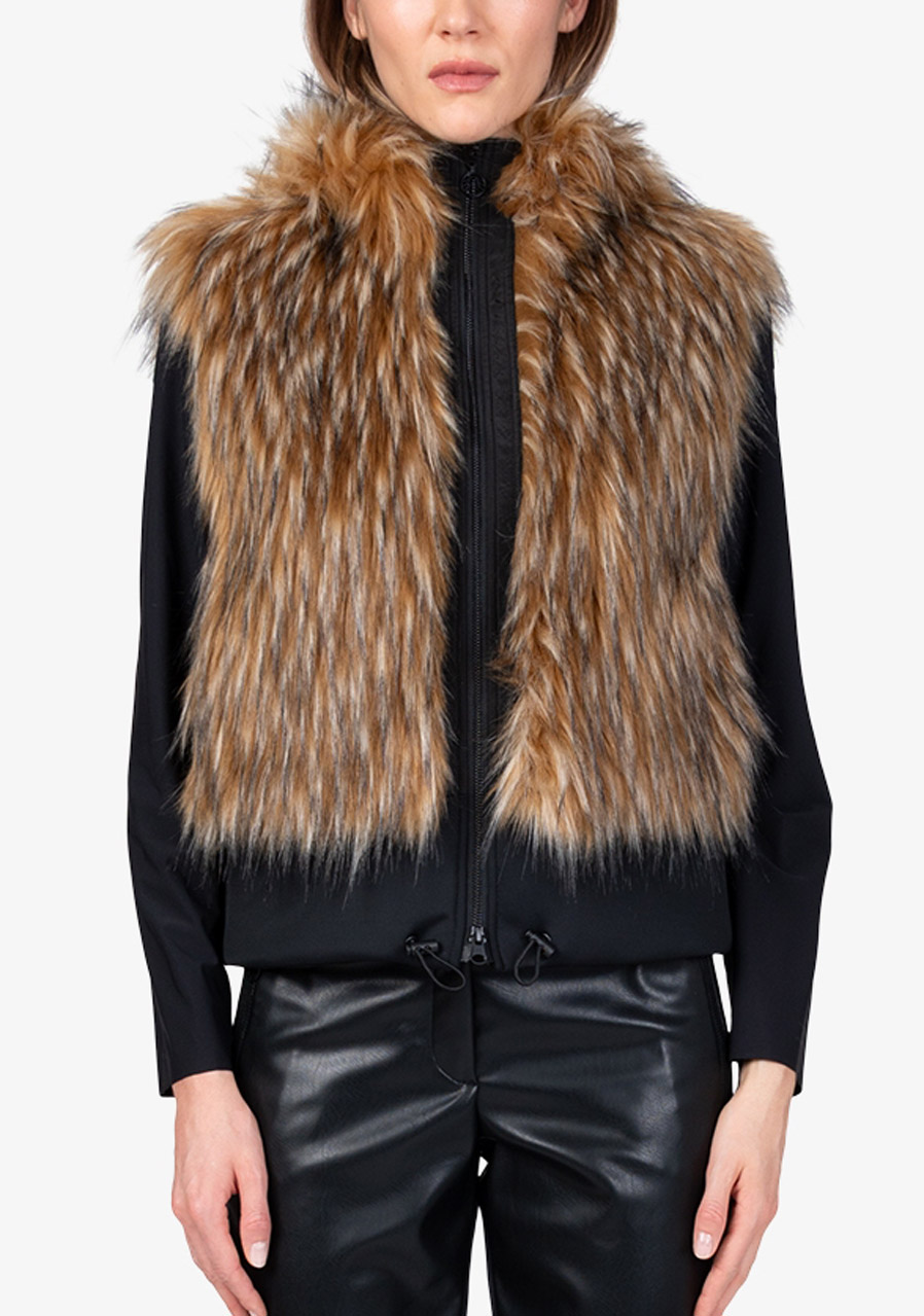 The Sportalm Faux Fur Vest with Hood is a luxurious accessory that combines elegance, warmth and modern design. Made of soft faux fur in a Finnraccoon look combined with stretchy scuba material, it looks exclusive while remaining comfortable to wear. The hood gives the vest a casually stylish character, while the two-way zipper and side pockets increase practicality. The wide scuba hem with drawstring allows you to adjust the width of the bottom edge as needed. Thanks to the full lining and precise workmanship, this vest is ideal for layering and elegant winter outfits.